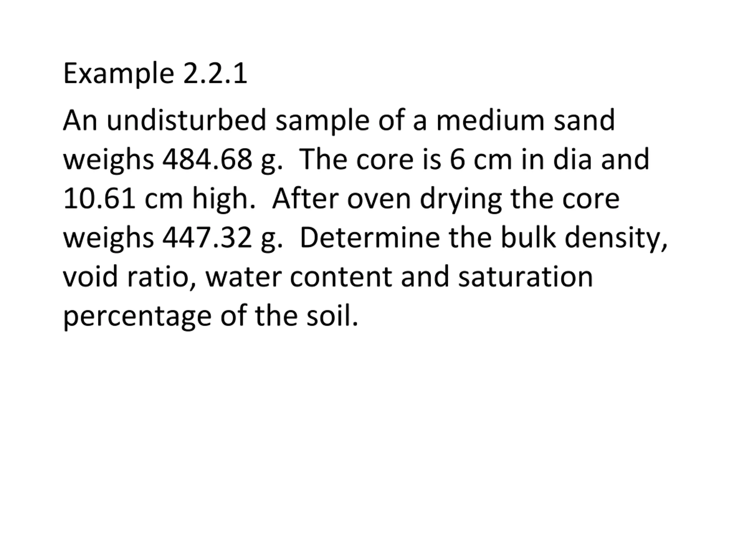 Example 2.2.1 An undisturbed sample of a medium sand weighs 484.68 g. The core is 6 cm in dia and 10.61 cm high. After oven drying the core weighs 447.32 g. Determine the bulk density, void ratio, water content and saturation percentage of the soil.