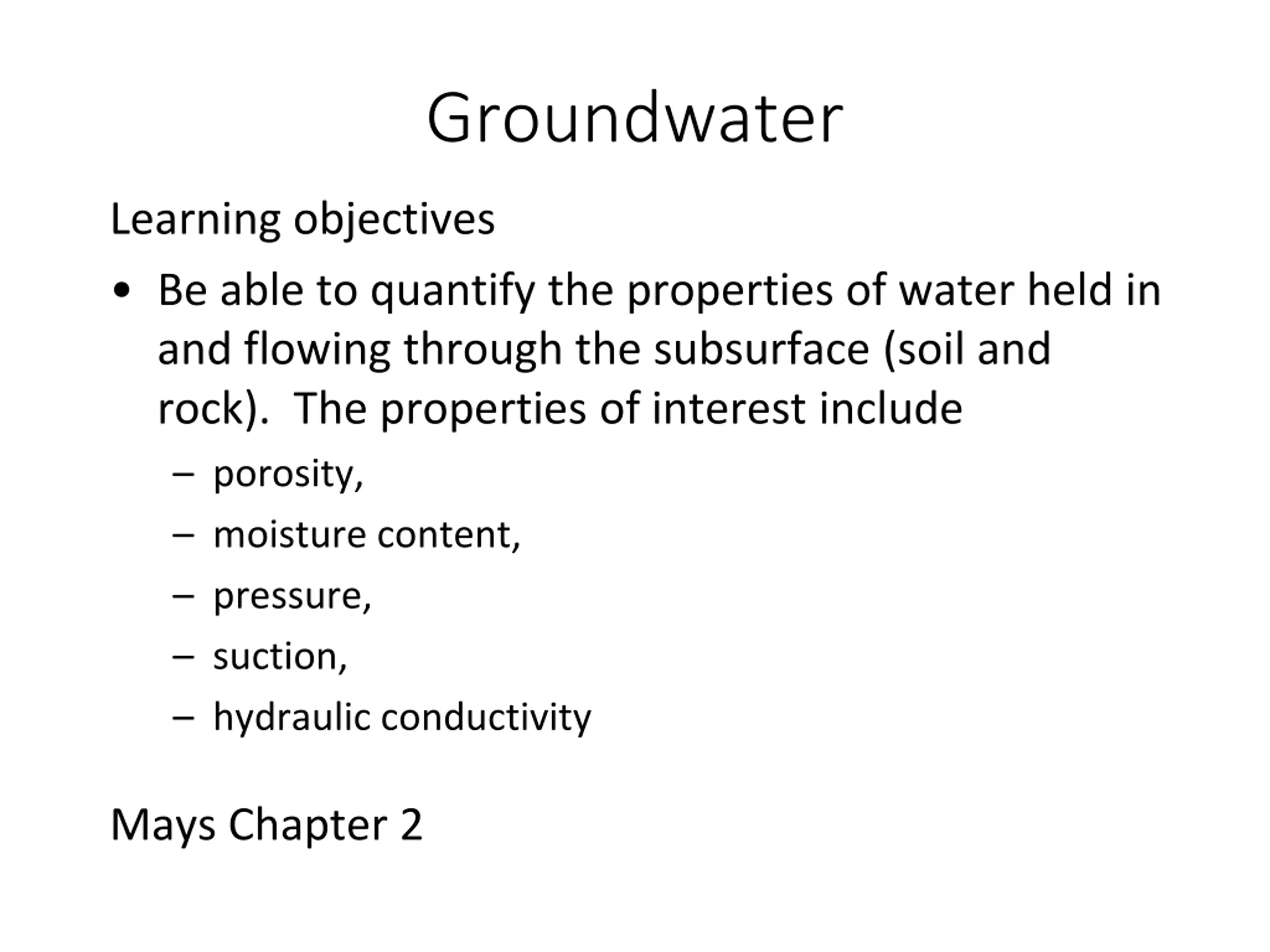 Groundwater Learning objectives Be able to quantify the properties of water held in and flowing through the subsurface (soil and rock). The properties of interest include porosity, moisture content, pressure, suction, hydraulic conductivity Mays Chapter 2