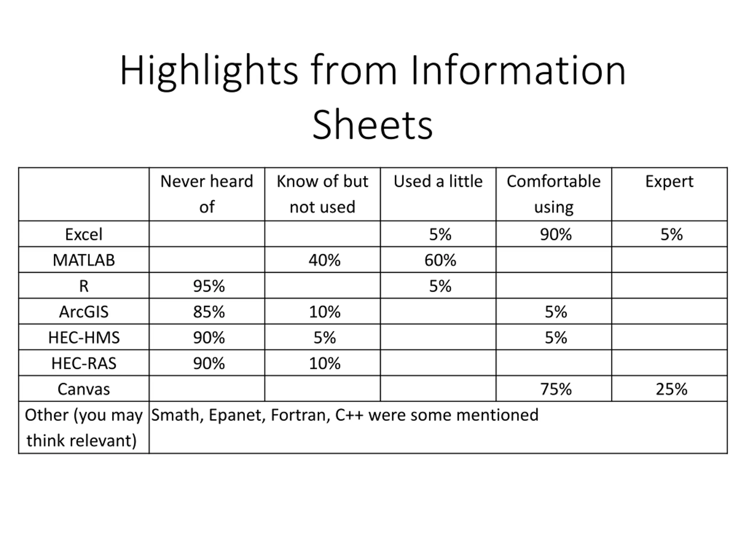 Highlights from Information Sheets Never heard of Know of but not used Used a little Comfortable using 90% Expert Excel MATLAB R ArcGIS HEC-HMS HEC-RAS Canvas Other (you may think relevant) 5% 60% 5% 5% 40% 95% 85% 90% 90% 10% 5% 10% 5% 5% 75% 25% Smath, Epanet, Fortran, C++ were some mentioned