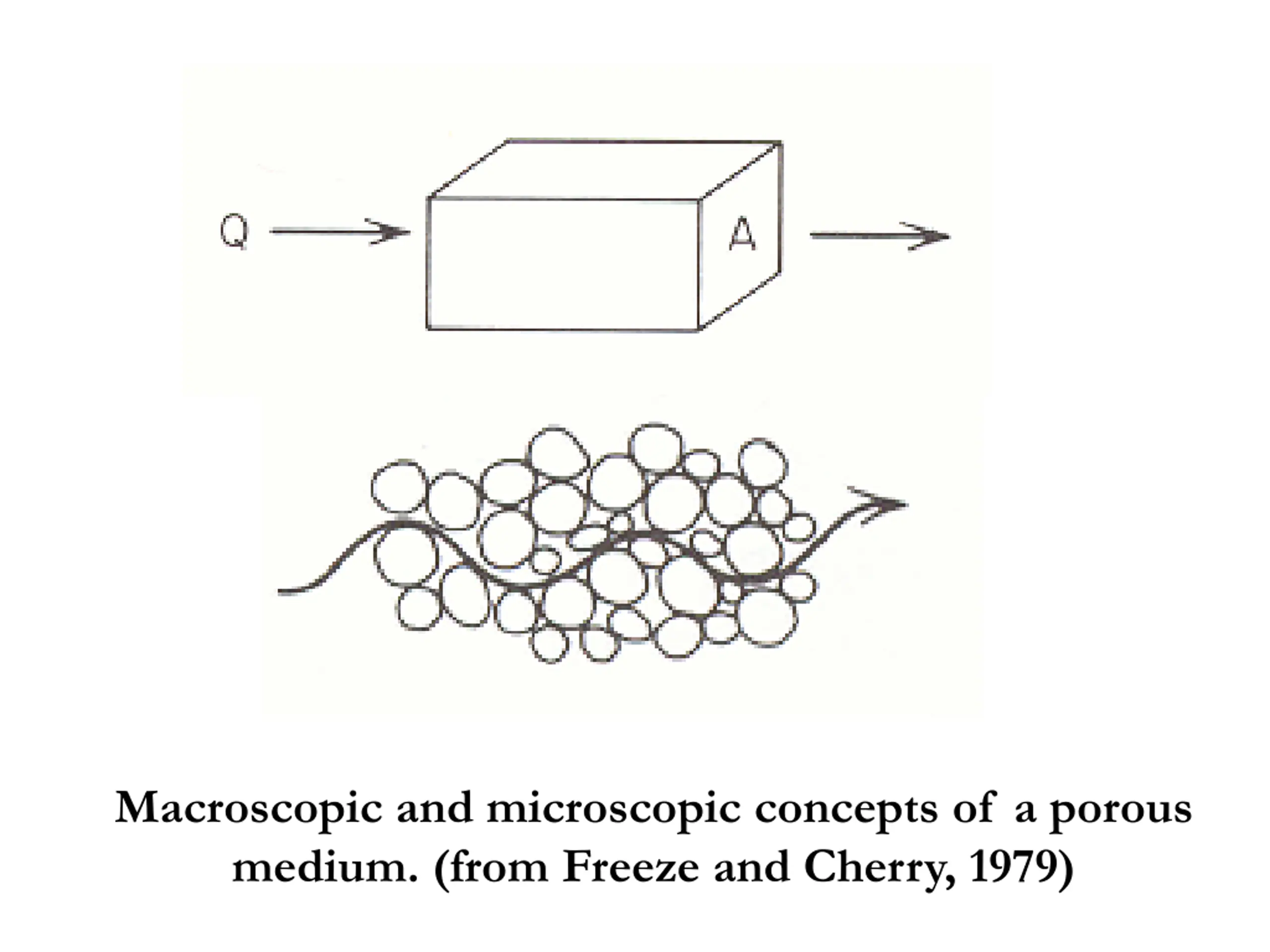 Macroscopic and microscopic concepts of a porous medium. (from Freeze and Cherry, 1979)