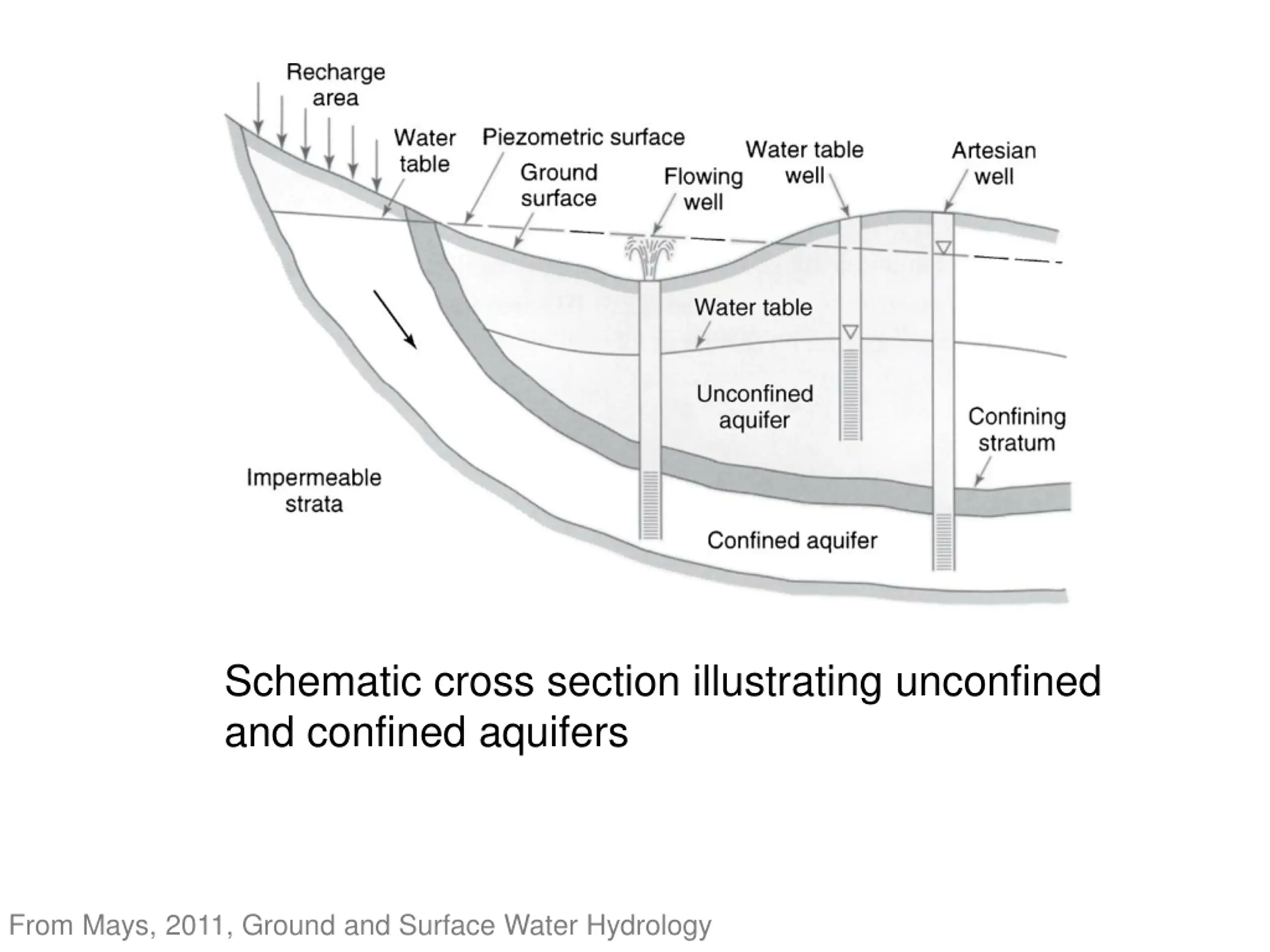 Schematic cross section illustrating unconfined and confined aquifers From Mays, 2011, Ground and Surface Water Hydrology