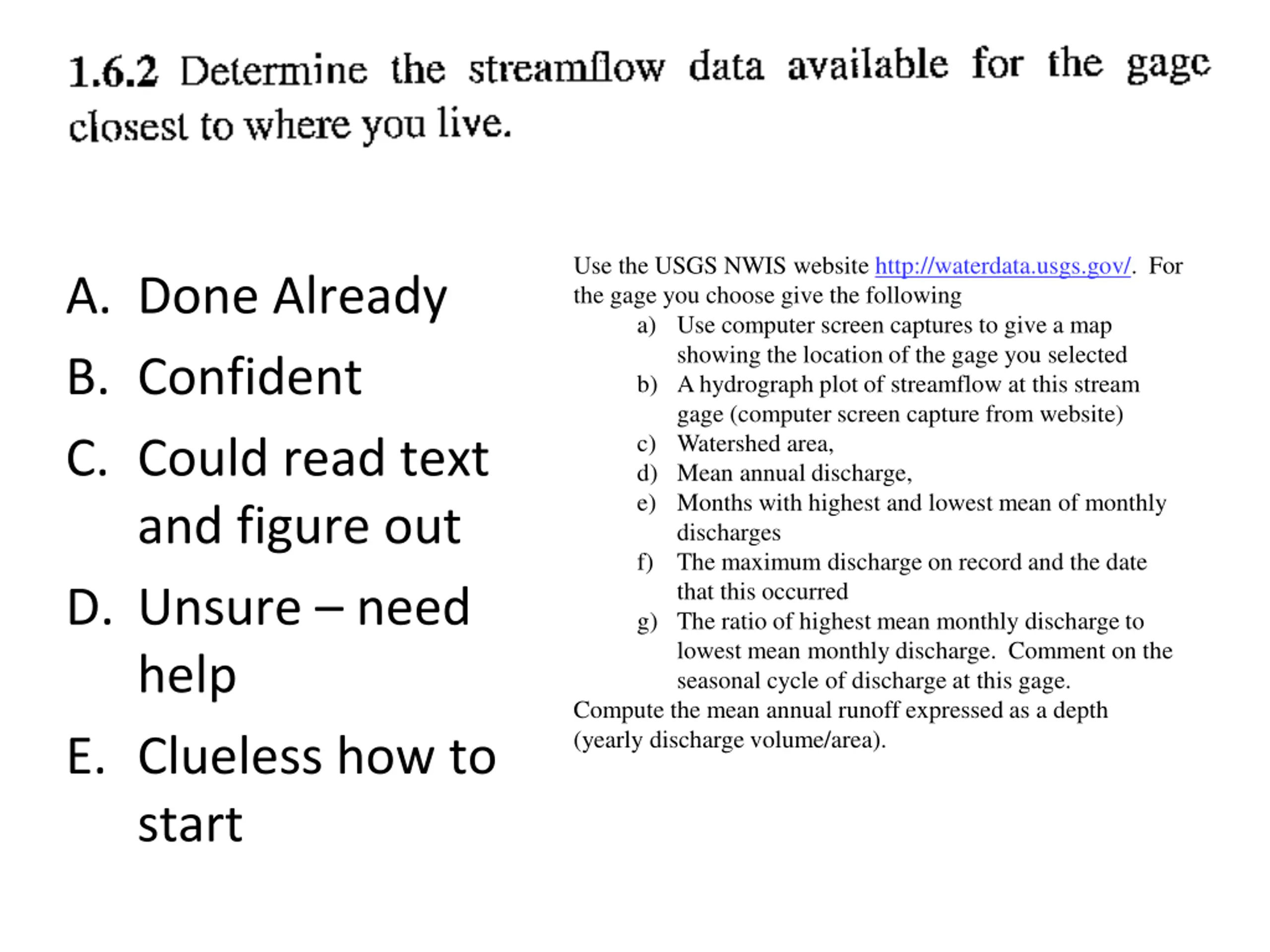 Use the USGS NWIS website http://waterdata.usgs.gov/. For the gage you choose give the following a) Use computer screen captures to give a map showing the location of the gage you selected b) A hydrograph plot of streamflow at this stream gage (computer screen capture from website) c) Watershed area, d) Mean annual discharge, e) Months with highest and lowest mean of monthly discharges f) The maximum discharge on record and the date that this occurred g) The ratio of highest mean monthly discharge to lowest mean monthly discharge. Comment on the seasonal cycle of discharge at this gage. Compute the mean annual runoff expressed as a depth (yearly discharge volume/area). A. Done Already B. Confident C. Could read text and figure out D. Unsure need help E. Clueless how to start