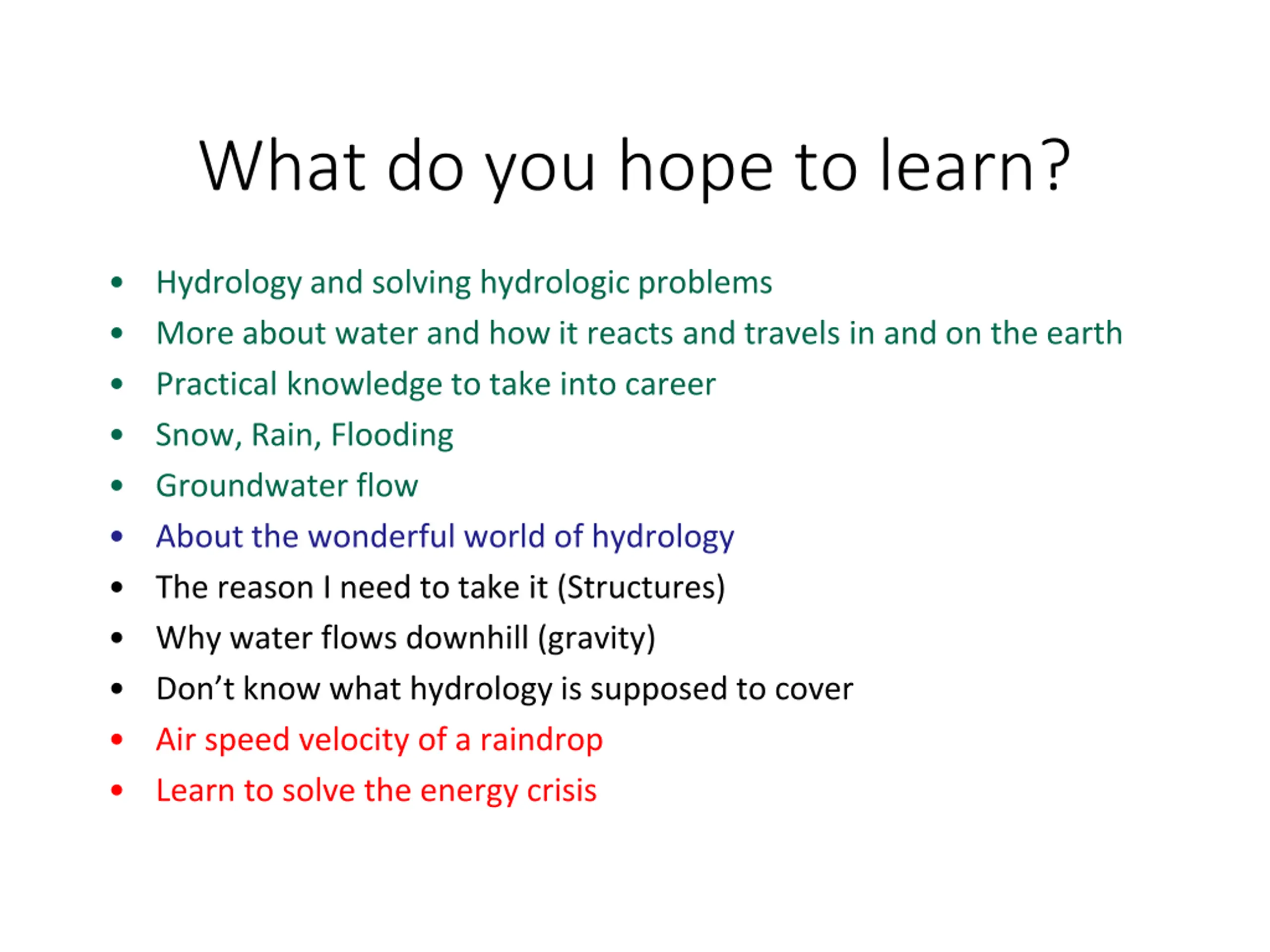 What do you hope to learn? Hydrology and solving hydrologic problems More about water and how it reacts and travels in and on the earth Practical knowledge to take into career Snow, Rain, Flooding Groundwater flow About the wonderful world of hydrology The reason I need to take it (Structures) Why water flows downhill (gravity) Don t know what hydrology is supposed to cover Air speed velocity of a raindrop Learn to solve the energy crisis
