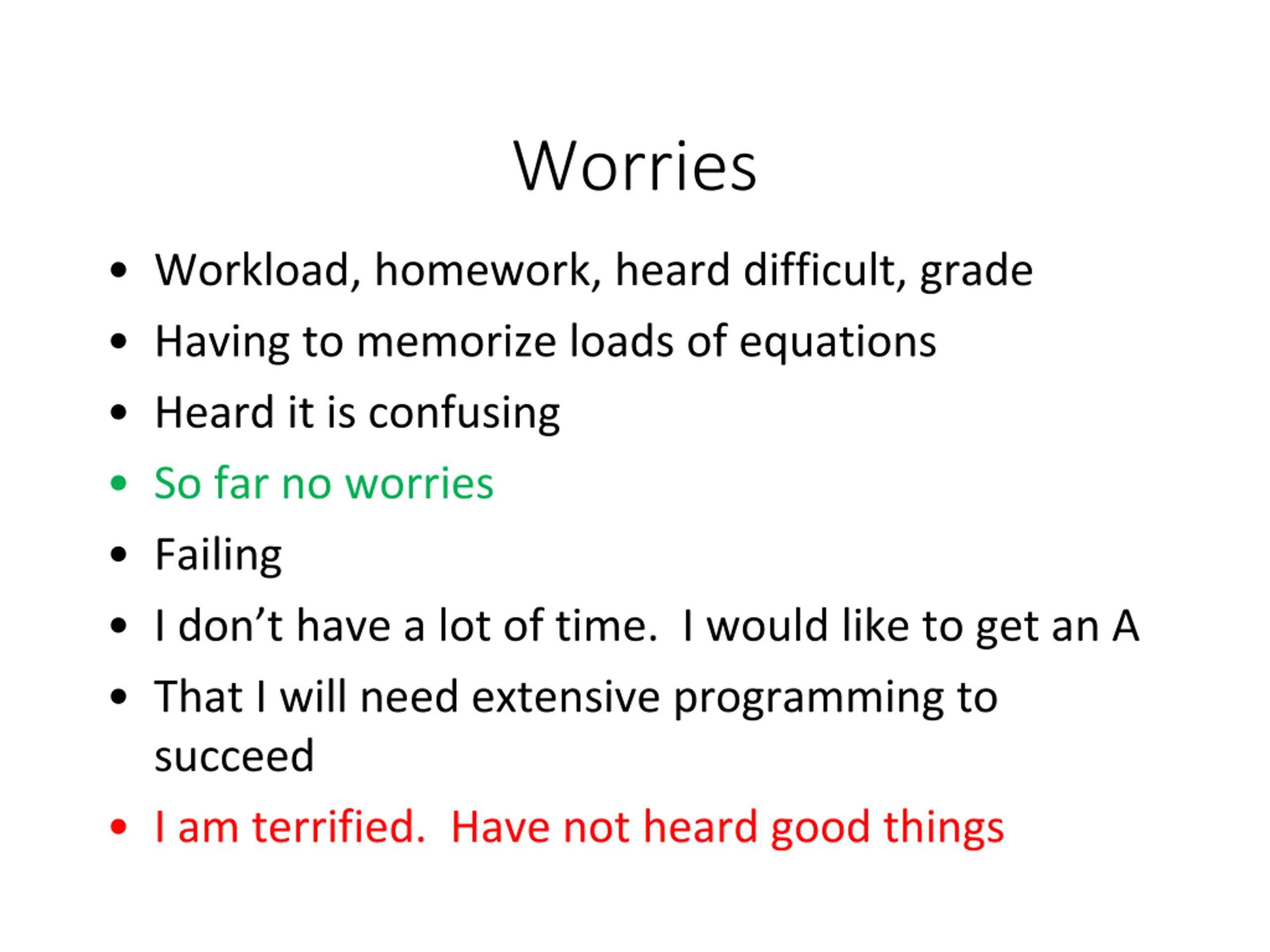 Worries Workload, homework, heard difficult, grade Having to memorize loads of equations Heard it is confusing So far no worries Failing I don t have a lot of time. I would like to get an A That I will need extensive programming to succeed I am terrified. Have not heard good things