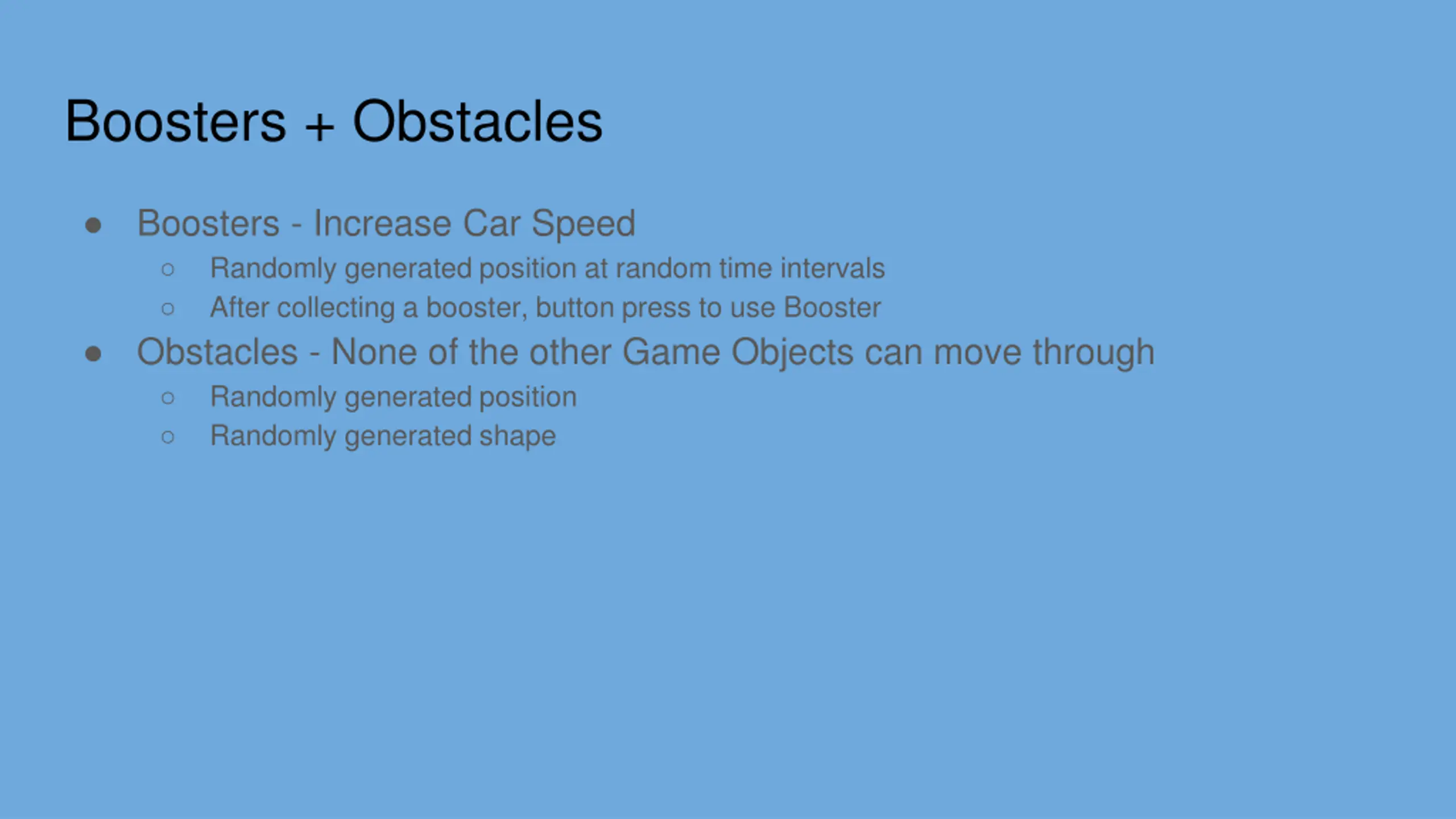 Boosters + Obstacles Boosters - Increase Car Speed Randomly generated position at random time intervals After collecting a booster, button press to use Booster Obstacles - None of the other Game Objects can move through Randomly generated position Randomly generated shape