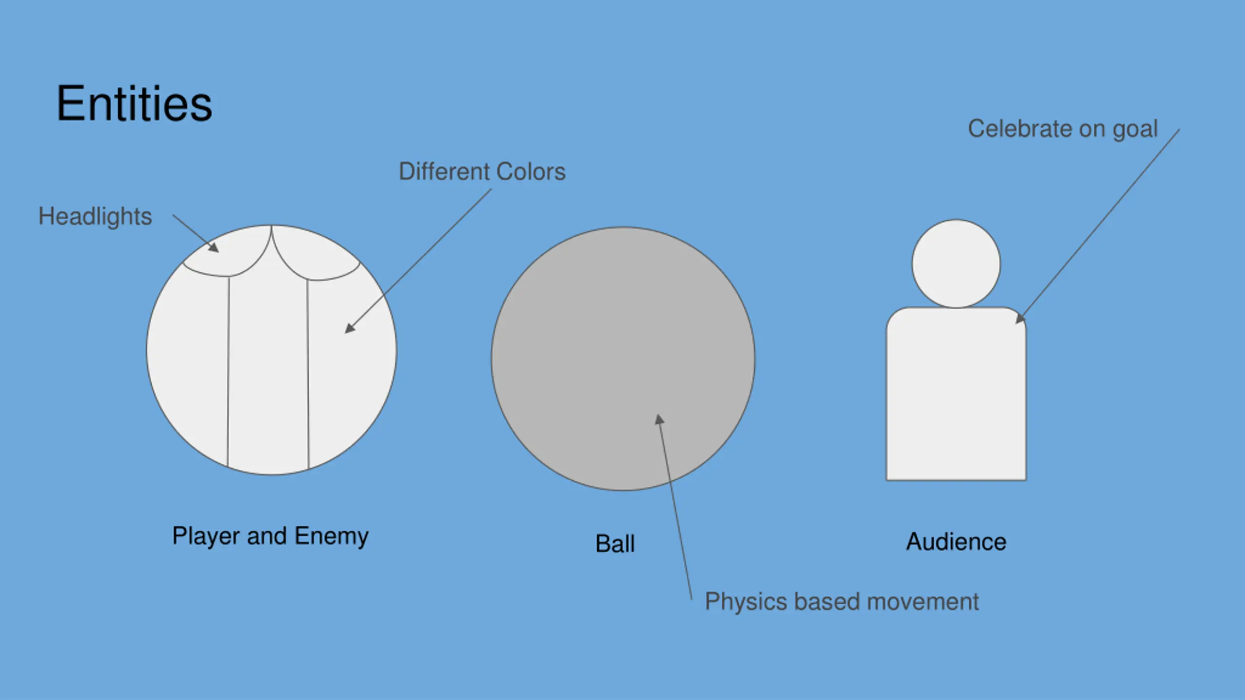 Entities Celebrate on goal Different Colors Headlights Player and Enemy Audience Ball Physics based movement