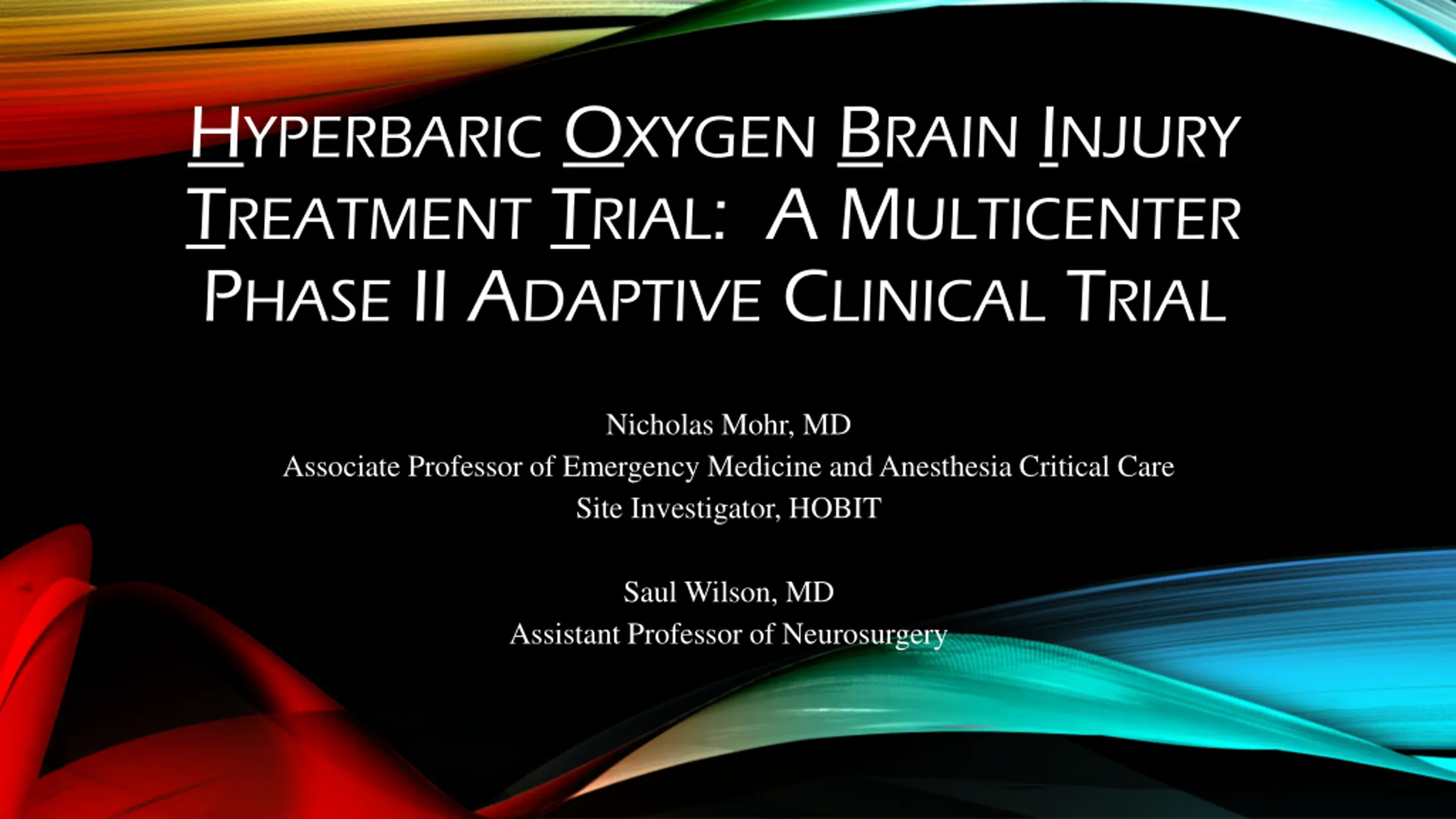 HYPERBARIC OXYGEN BRAIN INJURY TREATMENT TRIAL: A MULTICENTER PHASE II ADAPTIVE CLINICAL TRIAL Nicholas Mohr, MD Associate Professor of Emergency Medicine and Anesthesia Critical Care Site Investigator, HOBIT Saul Wilson, MD Assistant Professor of Neurosurgery