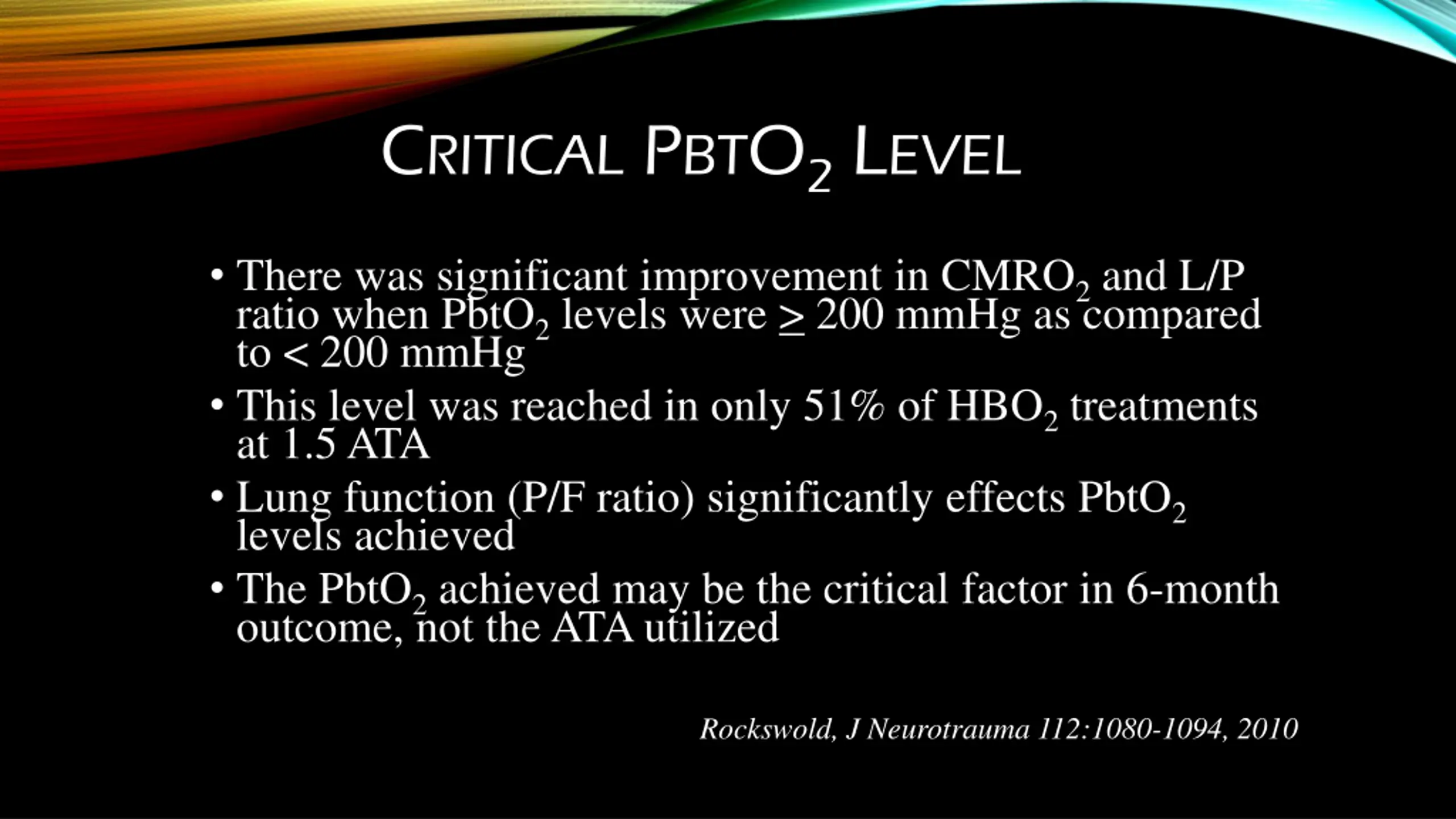 CRITICAL PBTO2 LEVEL There was significant improvement in CMRO2 and L/P ratio when PbtO2 levels were > 200 mmHg as compared to < 200 mmHg This level was reached in only 51% of HBO2 treatments at 1.5 ATA Lung function (P/F ratio) significantly effects PbtO2 levels achieved The PbtO2 achieved may be the critical factor in 6-month outcome, not the ATA utilized Rockswold, J Neurotrauma 112:1080-1094, 2010