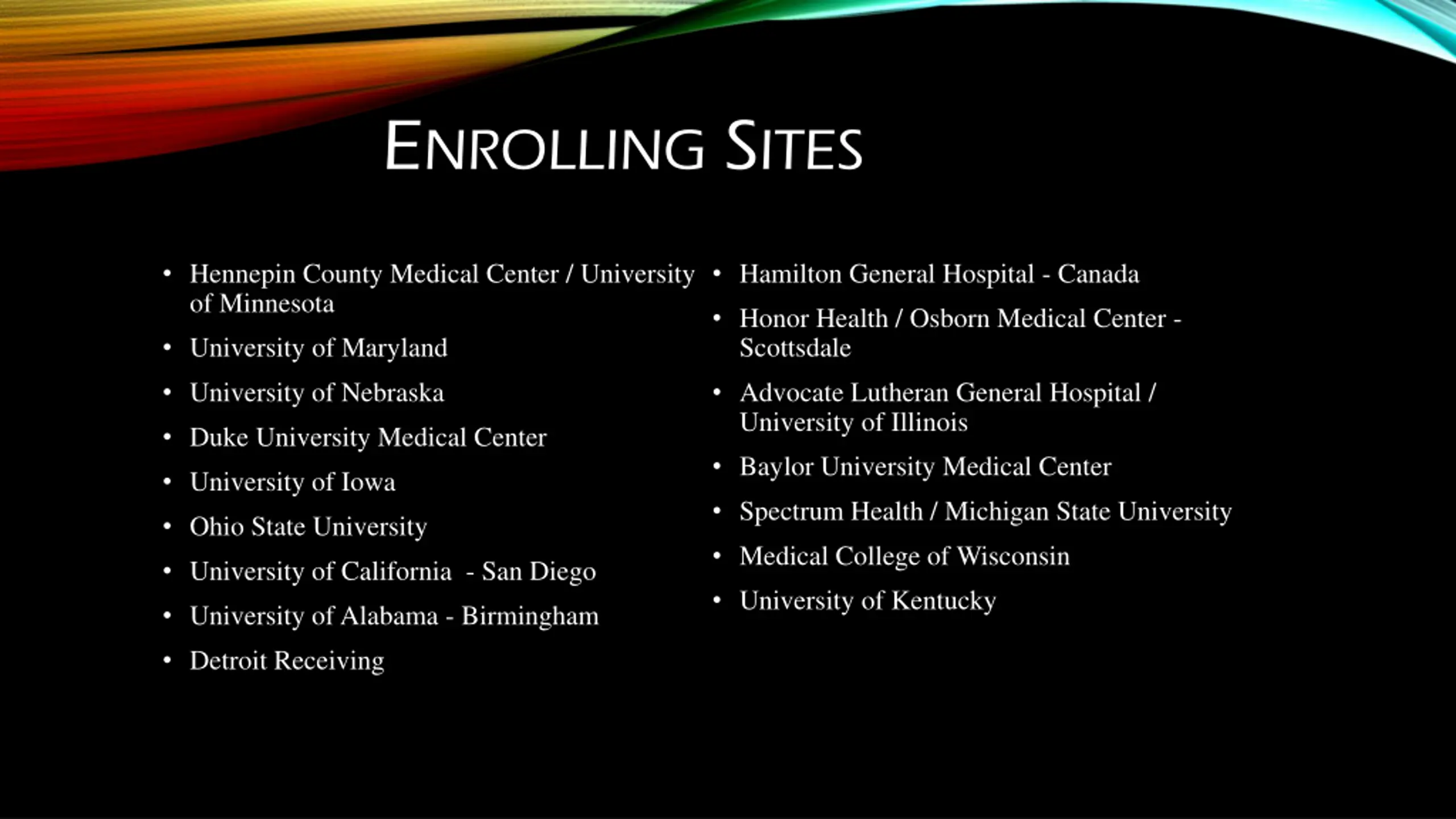 ENROLLING SITES Hennepin County Medical Center / University of Minnesota Hamilton General Hospital - Canada Honor Health / Osborn Medical Center - Scottsdale University of Maryland University of Nebraska Advocate Lutheran General Hospital / University of Illinois Duke University Medical Center Baylor University Medical Center University of Iowa Spectrum Health / Michigan State University Ohio State University Medical College of Wisconsin University of Kentucky University of California - San Diego University of Alabama - Birmingham Detroit Receiving