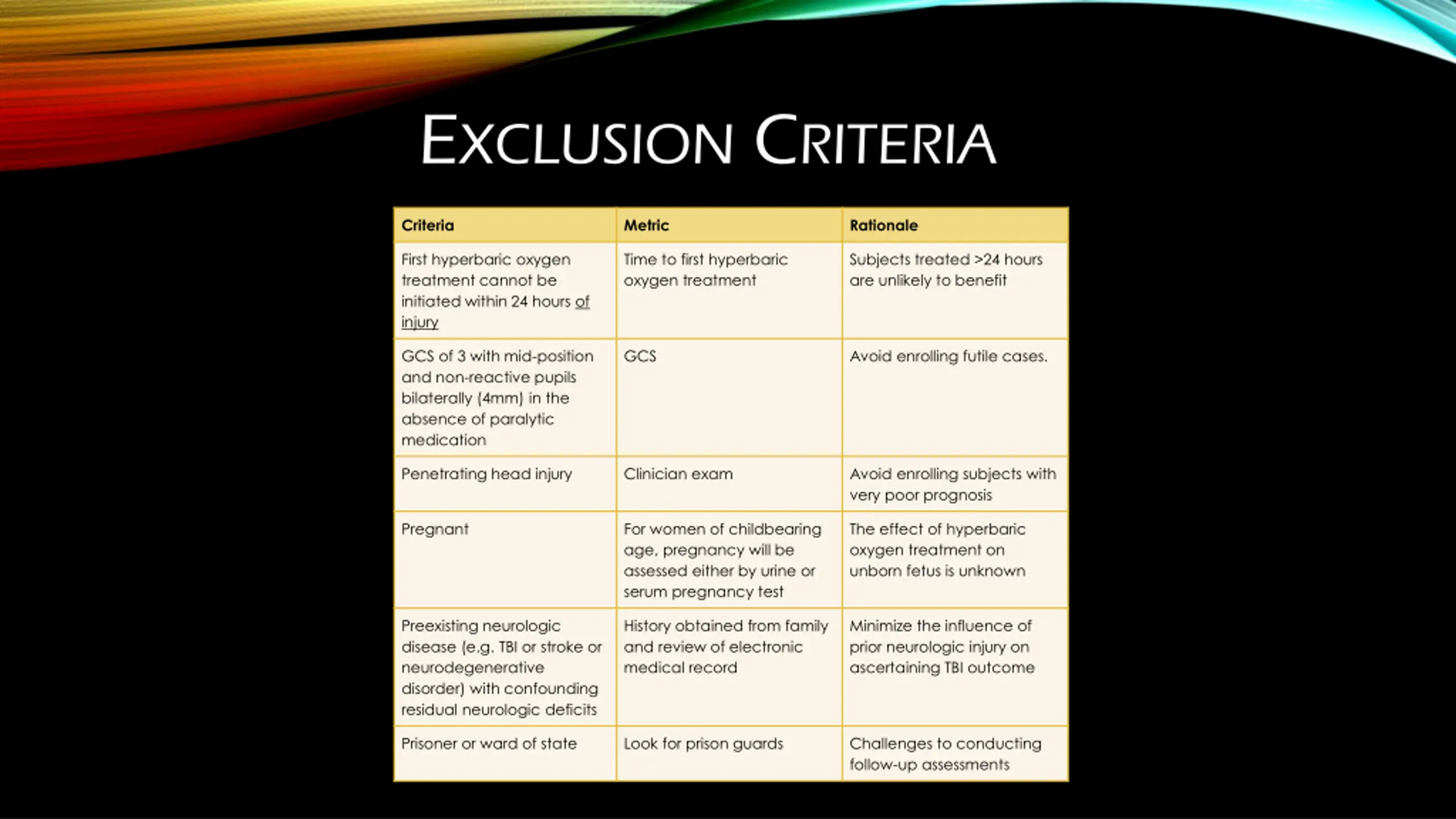 EXCLUSION CRITERIA Criteria Metric Rationale First hyperbaric oxygen treatment cannot be initiated within 24 hours of injury Time to first hyperbaric oxygen treatment Subjects treated >24 hours are unlikely to benefit GCS of 3 with mid-position and non-reactive pupils bilaterally (4mm) in the absence of paralytic medication GCS Avoid enrolling futile cases. Penetrating head injury Clinician exam Avoid enrolling subjects with very poor prognosis Pregnant For women of childbearing age, pregnancy will be assessed either by urine or serum pregnancy test The effect of hyperbaric oxygen treatment on unborn fetus is unknown Preexisting neurologic disease (e.g. TBI or stroke or neurodegenerative disorder) with confounding residual neurologic deficits History obtained from family and review of electronic medical record Minimize the influence of prior neurologic injury on ascertaining TBI outcome Prisoner or ward of state Look for prison guards Challenges to conducting follow-up assessments