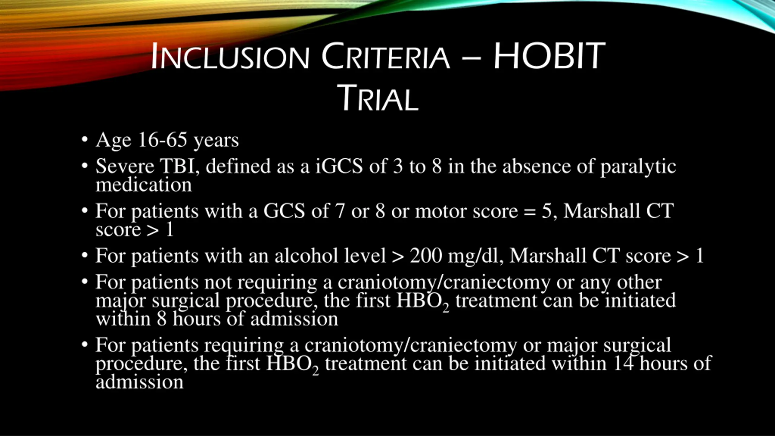 INCLUSION CRITERIA HOBIT TRIAL Age 16-65 years Severe TBI, defined as a iGCS of 3 to 8 in the absence of paralytic medication For patients with a GCS of 7 or 8 or motor score = 5, Marshall CT score > 1 For patients with an alcohol level > 200 mg/dl, Marshall CT score > 1 For patients not requiring a craniotomy/craniectomy or any other major surgical procedure, the first HBO2 treatment can be initiated within 8 hours of admission For patients requiring a craniotomy/craniectomy or major surgical procedure, the first HBO2 treatment can be initiated within 14 hours of admission