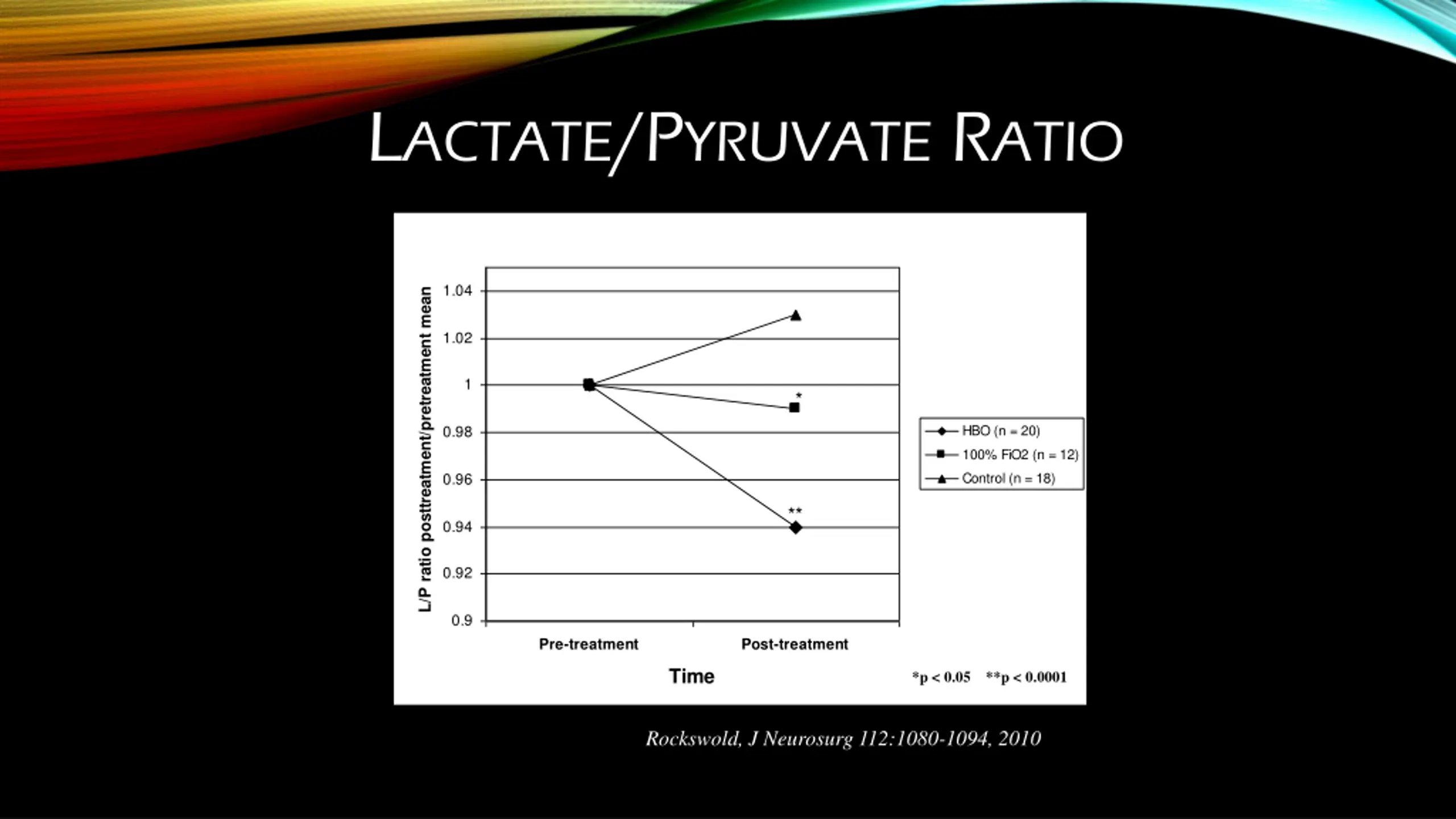 LACTATE/PYRUVATE RATIO 1.04 L/P ratio posttreatment/pretreatment mean 1.02 1 * HBO (n = 20) 0.98 100% FiO2 (n = 12) Control (n = 18) 0.96 ** 0.94 0.92 0.9 Pre-treatment Post-treatment Time *p < 0.05 **p < 0.0001 Rockswold, J Neurosurg 112:1080-1094, 2010