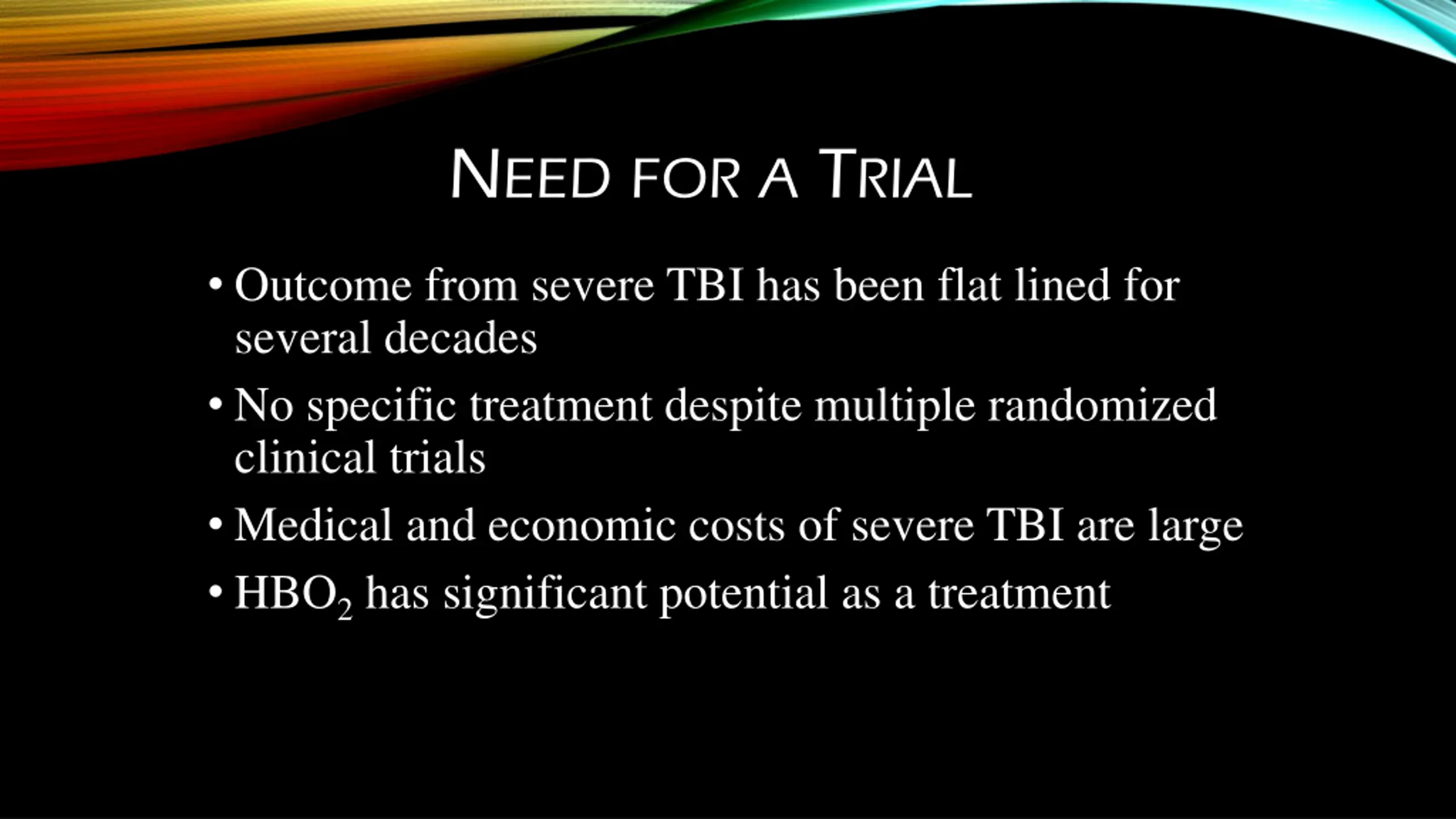 NEED FOR A TRIAL Outcome from severe TBI has been flat lined for several decades No specific treatment despite multiple randomized clinical trials Medical and economic costs of severe TBI are large HBO2has significant potential as a treatment