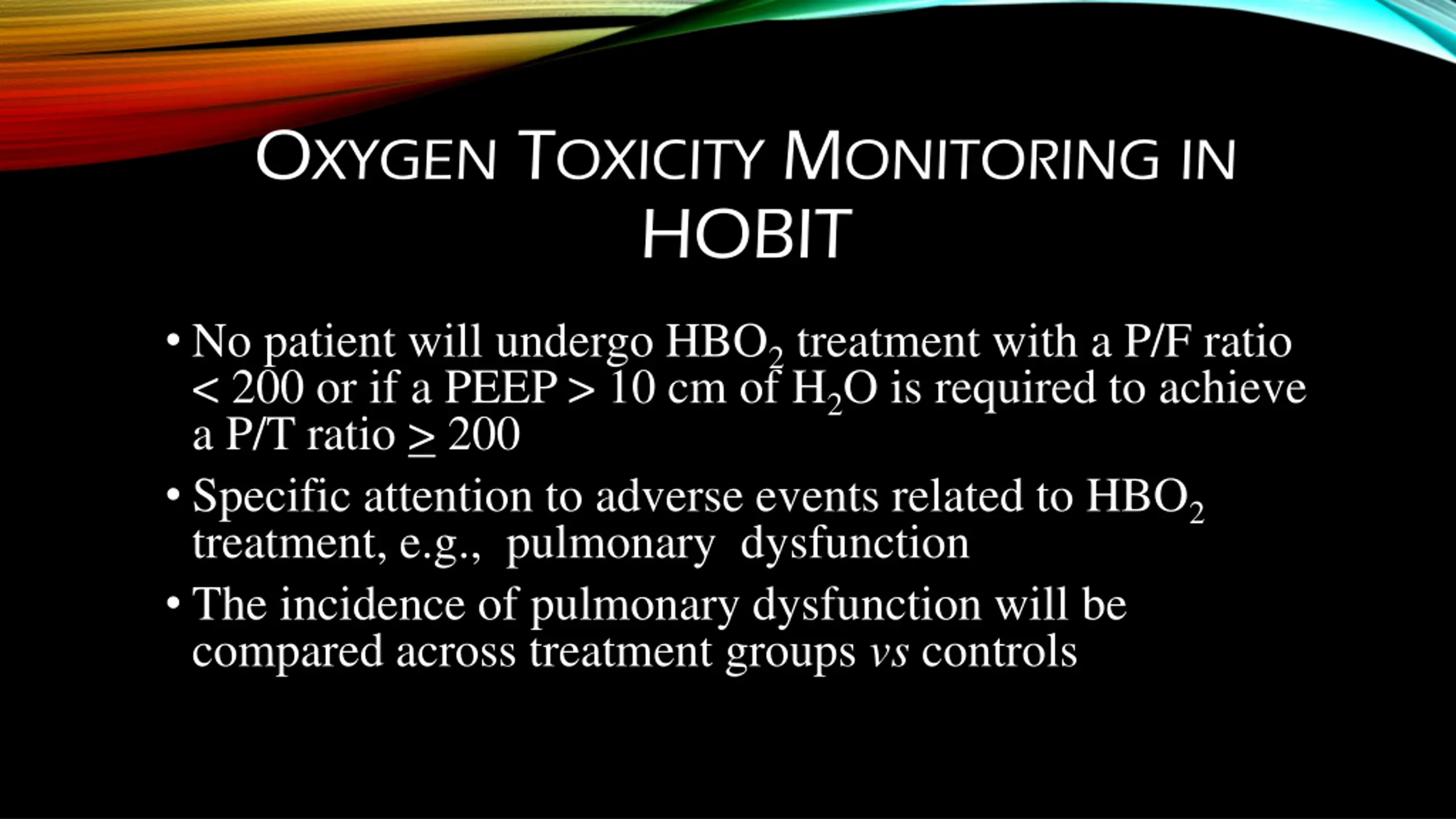 OXYGEN TOXICITY MONITORINGIN HOBIT No patient will undergo HBO2 treatment with a P/F ratio < 200 or if a PEEP > 10 cm of H2O is required to achieve a P/T ratio > 200 Specific attention to adverse events related to HBO2 treatment, e.g., pulmonary dysfunction The incidence of pulmonary dysfunction will be compared across treatment groups vs controls