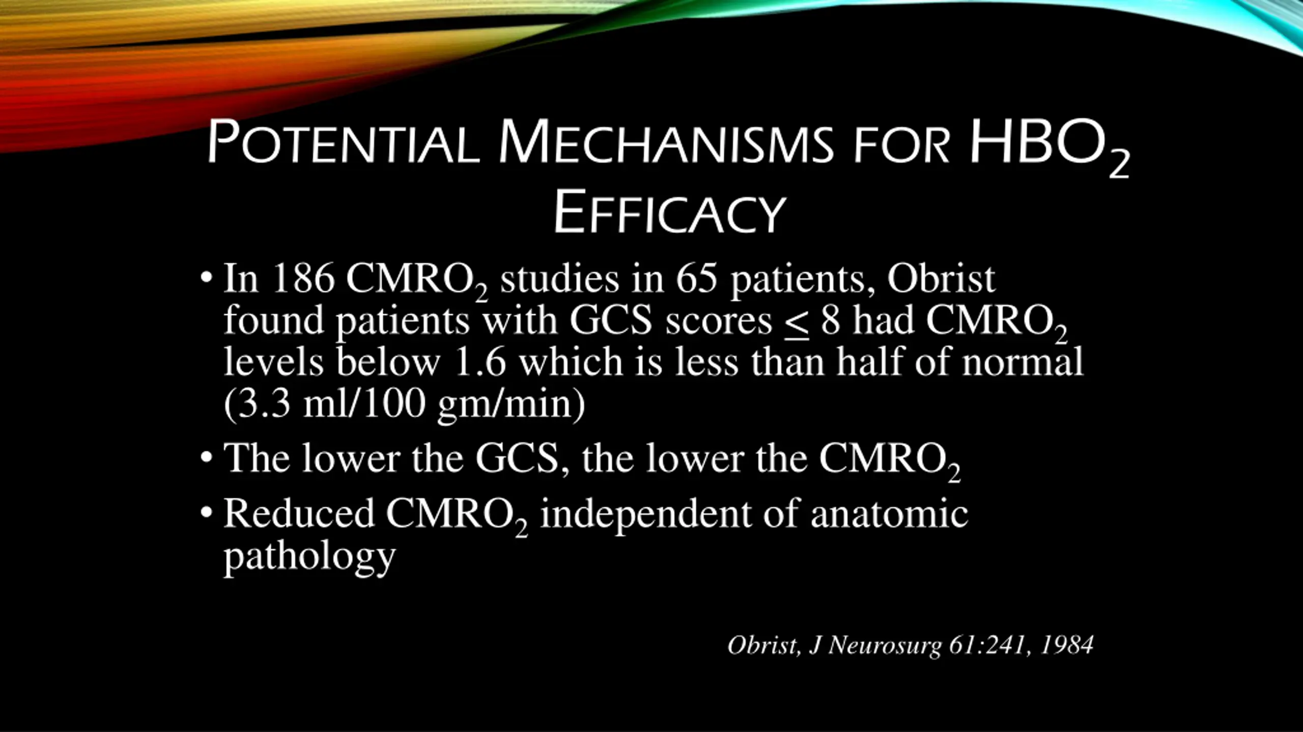 POTENTIAL MECHANISMS FOR HBO2 EFFICACY In 186 CMRO2studies in 65 patients, Obrist found patients with GCS scores < 8 had CMRO2 levels below 1.6 which is less than half of normal (3.3 ml/100 gm/min) The lower the GCS, the lower the CMRO2 Reduced CMRO2independent of anatomic pathology Obrist, J Neurosurg 61:241, 1984