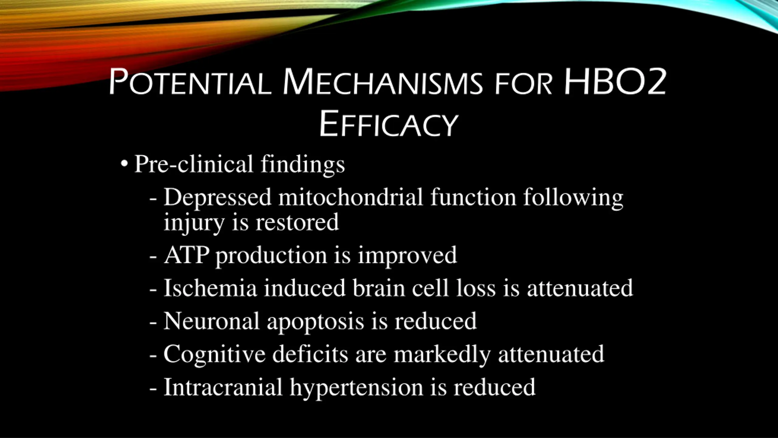 POTENTIAL MECHANISMS FOR HBO2 EFFICACY Pre-clinical findings - Depressed mitochondrial function following injury is restored - ATP production is improved - Ischemia induced brain cell loss is attenuated - Neuronal apoptosis is reduced - Cognitive deficits are markedly attenuated - Intracranial hypertension is reduced