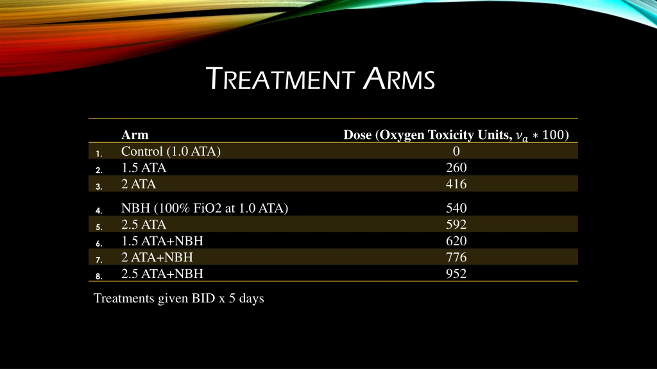 TREATMENT ARMS Arm Control (1.0 ATA) 1.5 ATA 2 ATA Dose (Oxygen Toxicity Units, ?? 100) 0 260 416 1. 2. 3. NBH (100% FiO2 at 1.0 ATA) 2.5 ATA 1.5 ATA+NBH 2 ATA+NBH 2.5 ATA+NBH 540 592 620 776 952 4. 5. 6. 7. 8. Treatments given BID x 5 days