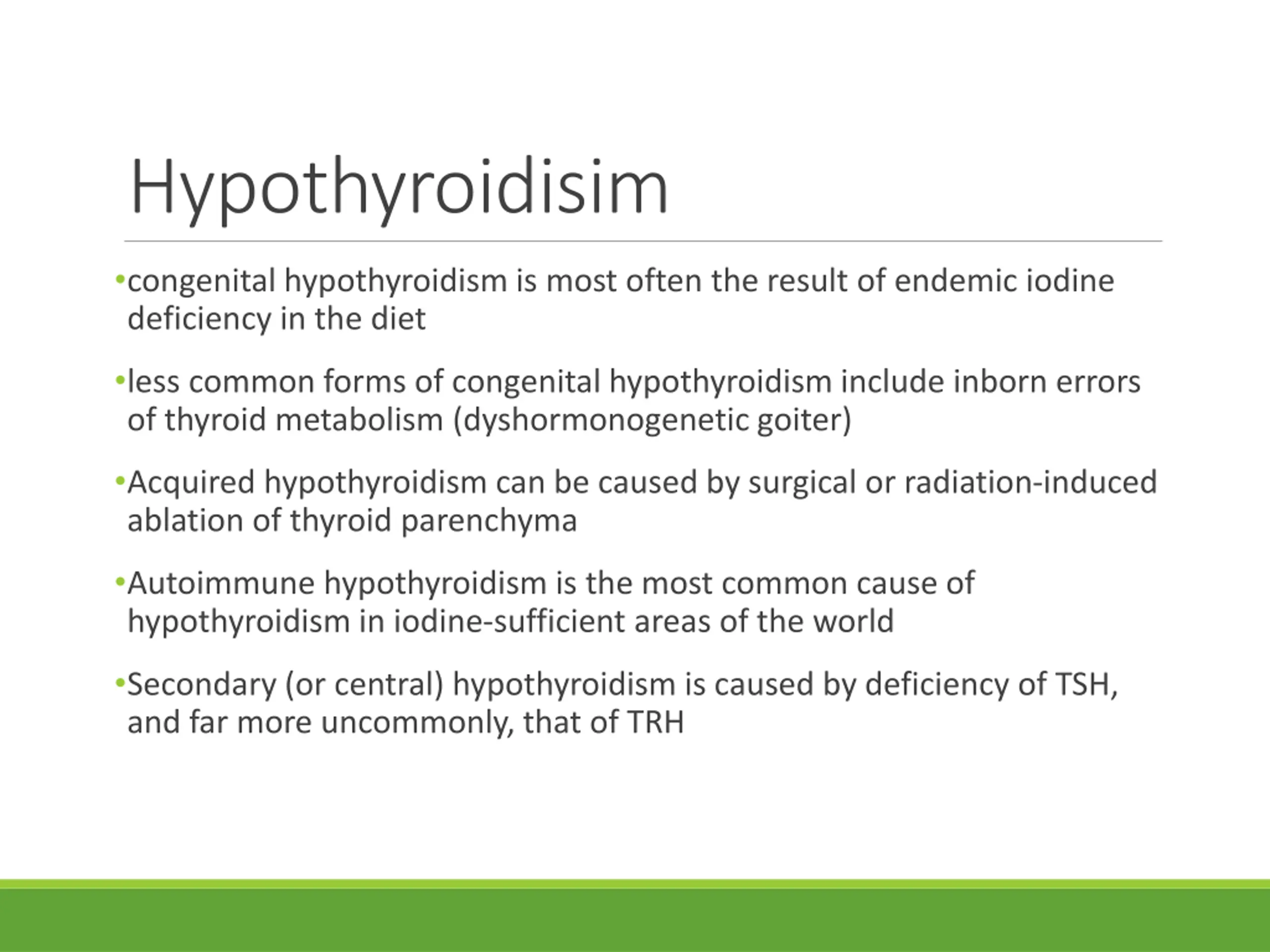 Hypothyroidisim congenital hypothyroidism is most often the result of endemic iodine deficiency in the diet less common forms of congenital hypothyroidism include inborn errors of thyroid metabolism (dyshormonogenetic goiter) Acquired hypothyroidism can be caused by surgical or radiation-induced ablation of thyroid parenchyma Autoimmune hypothyroidism is the most common cause of hypothyroidism in iodine-sufficient areas of the world Secondary (or central) hypothyroidism is caused by deficiency of TSH, and far more uncommonly, that of TRH