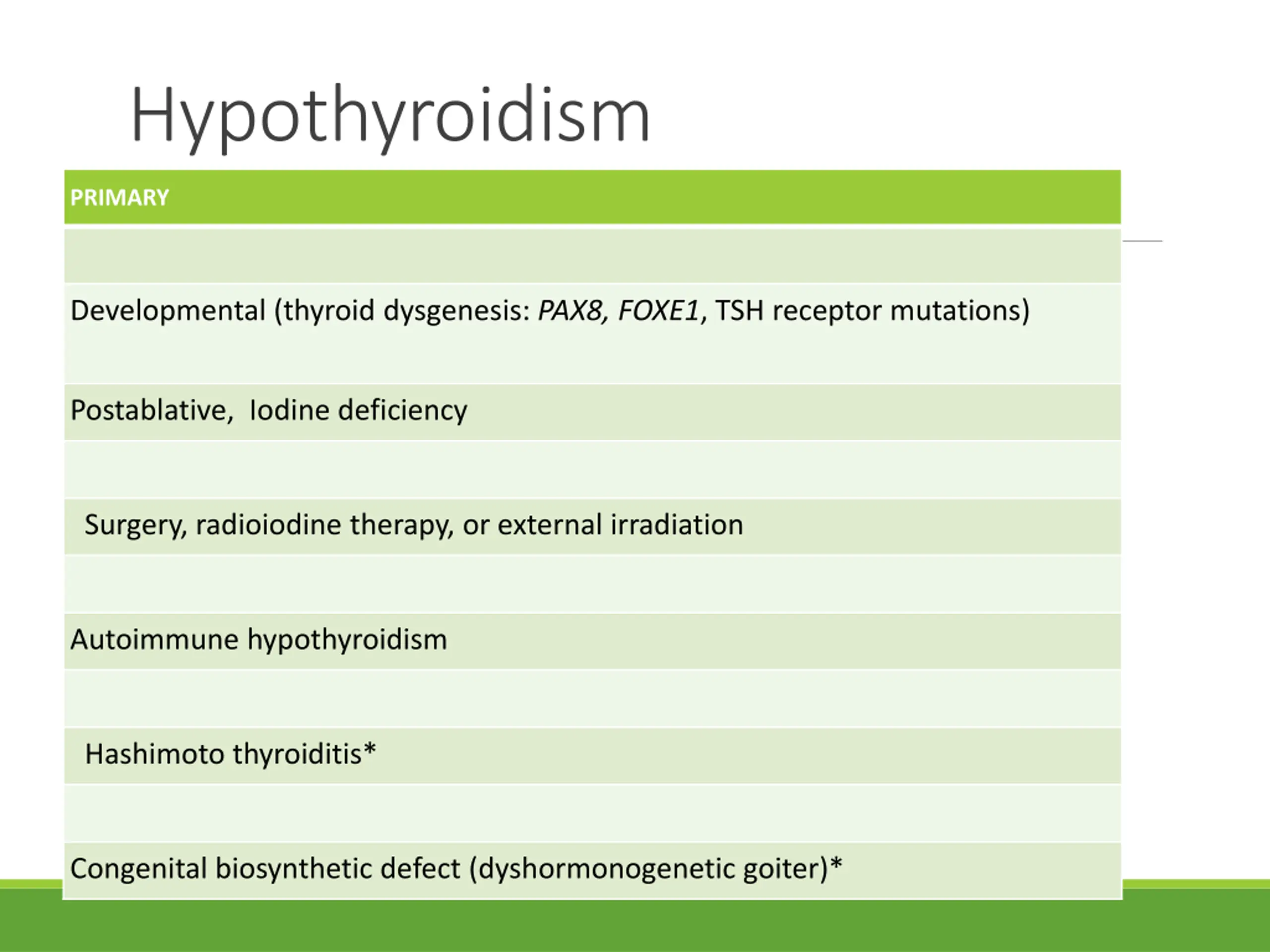 Hypothyroidism PRIMARY Developmental (thyroid dysgenesis: PAX8, FOXE1, TSH receptor mutations) Postablative, Iodine deficiency Surgery, radioiodine therapy, or external irradiation Autoimmune hypothyroidism Hashimoto thyroiditis* Congenital biosynthetic defect (dyshormonogenetic goiter)*