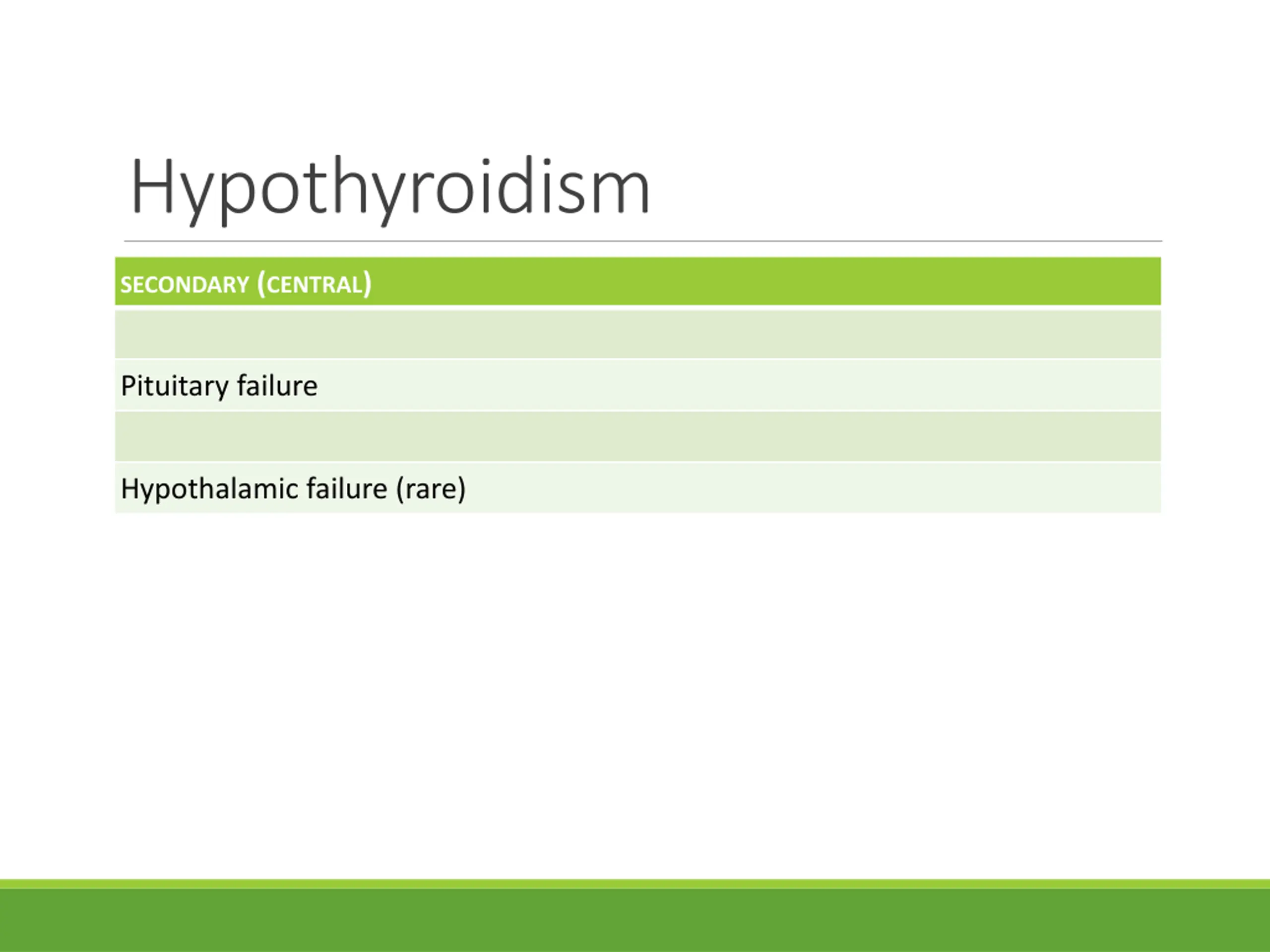 Hypothyroidism SECONDARY (CENTRAL) Pituitary failure Hypothalamic failure (rare)
