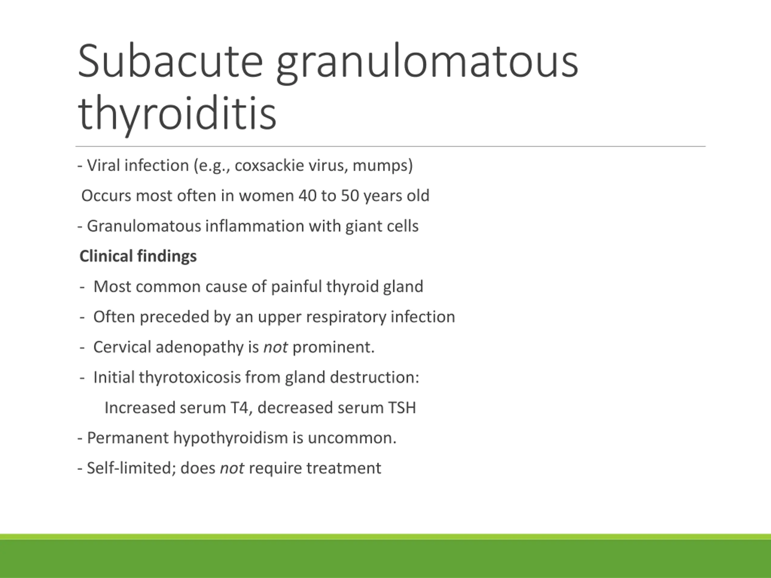 Subacute granulomatous thyroiditis - Viral infection (e.g., coxsackie virus, mumps) Occurs most often in women 40 to 50 years old - Granulomatous inflammation with giant cells Clinical findings - Most common cause of painful thyroid gland - Often preceded by an upper respiratory infection - Cervical adenopathy is not prominent. - Initial thyrotoxicosis from gland destruction: Increased serum T4, decreased serum TSH - Permanent hypothyroidism is uncommon. - Self-limited; does not require treatment