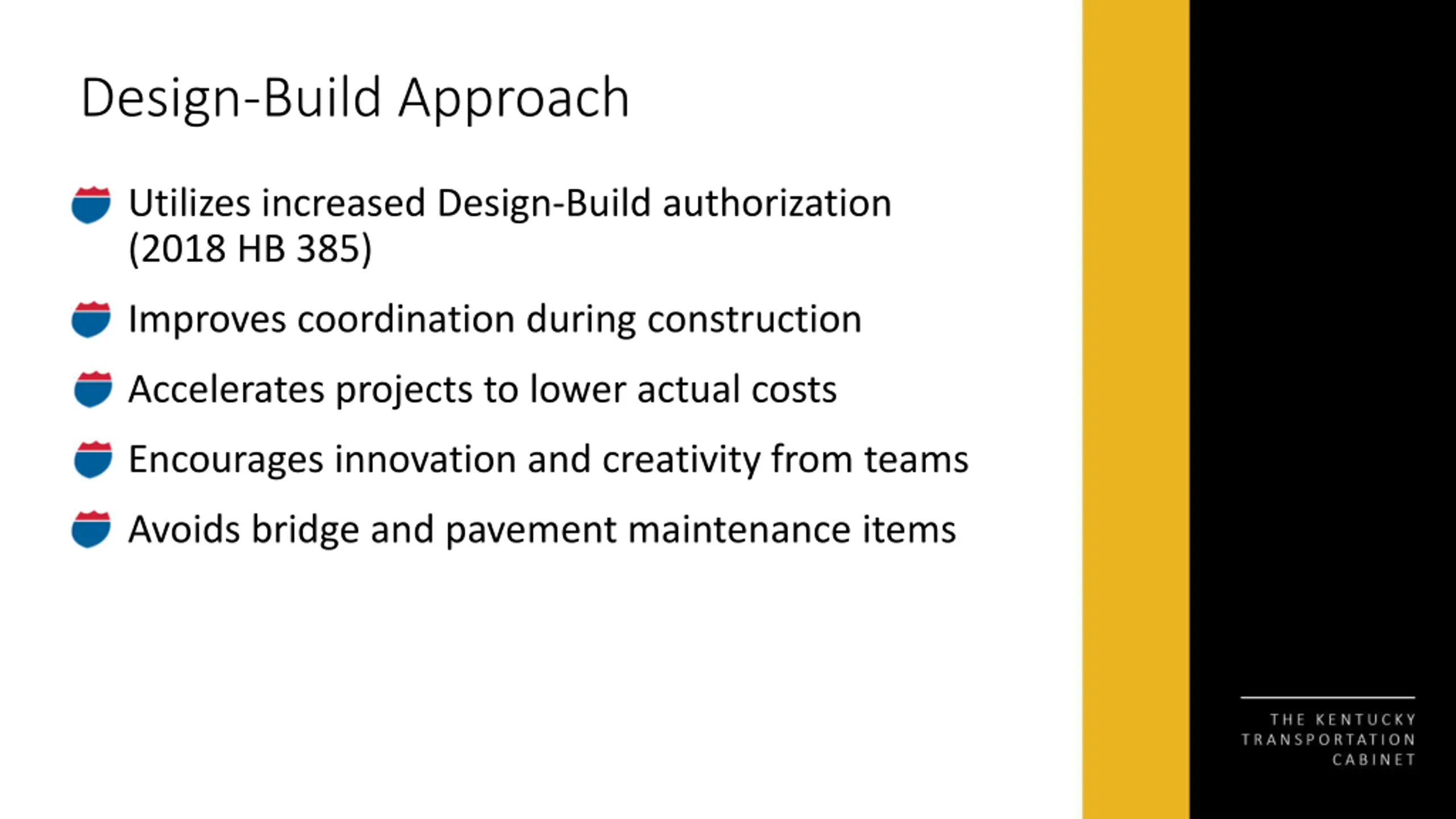 Design-Build Approach Utilizes increased Design-Build authorization (2018 HB 385) Improves coordination during construction Accelerates projects to lower actual costs Encourages innovation and creativity from teams Avoids bridge and pavement maintenance items
