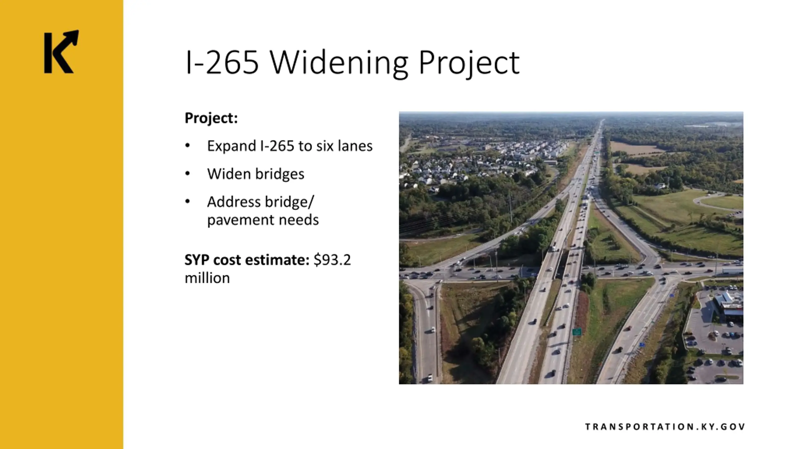 I-265 Widening Project Project: Expand I-265 to six lanes Widen bridges Address bridge/ pavement needs SYP cost estimate: $93.2 million T R A N S P O R TAT I O N . K Y. G O V