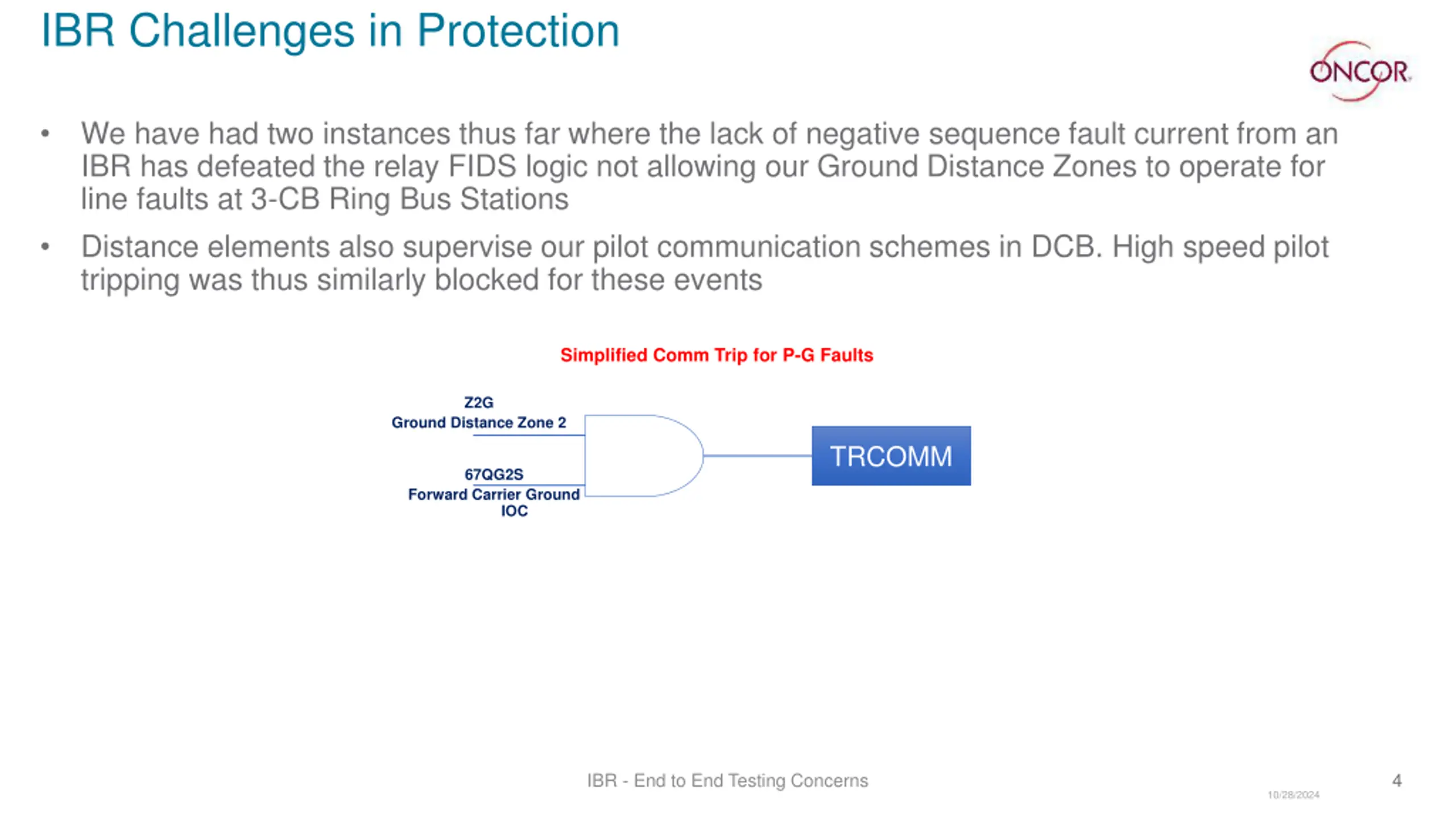 Explore the challenges faced by the Oncor system in protection related to IBR, including issues with negative sequence fault current, relay logic, and distance elements. Learn about the testing concerns and solutions for effective end-to-end protection testing.
