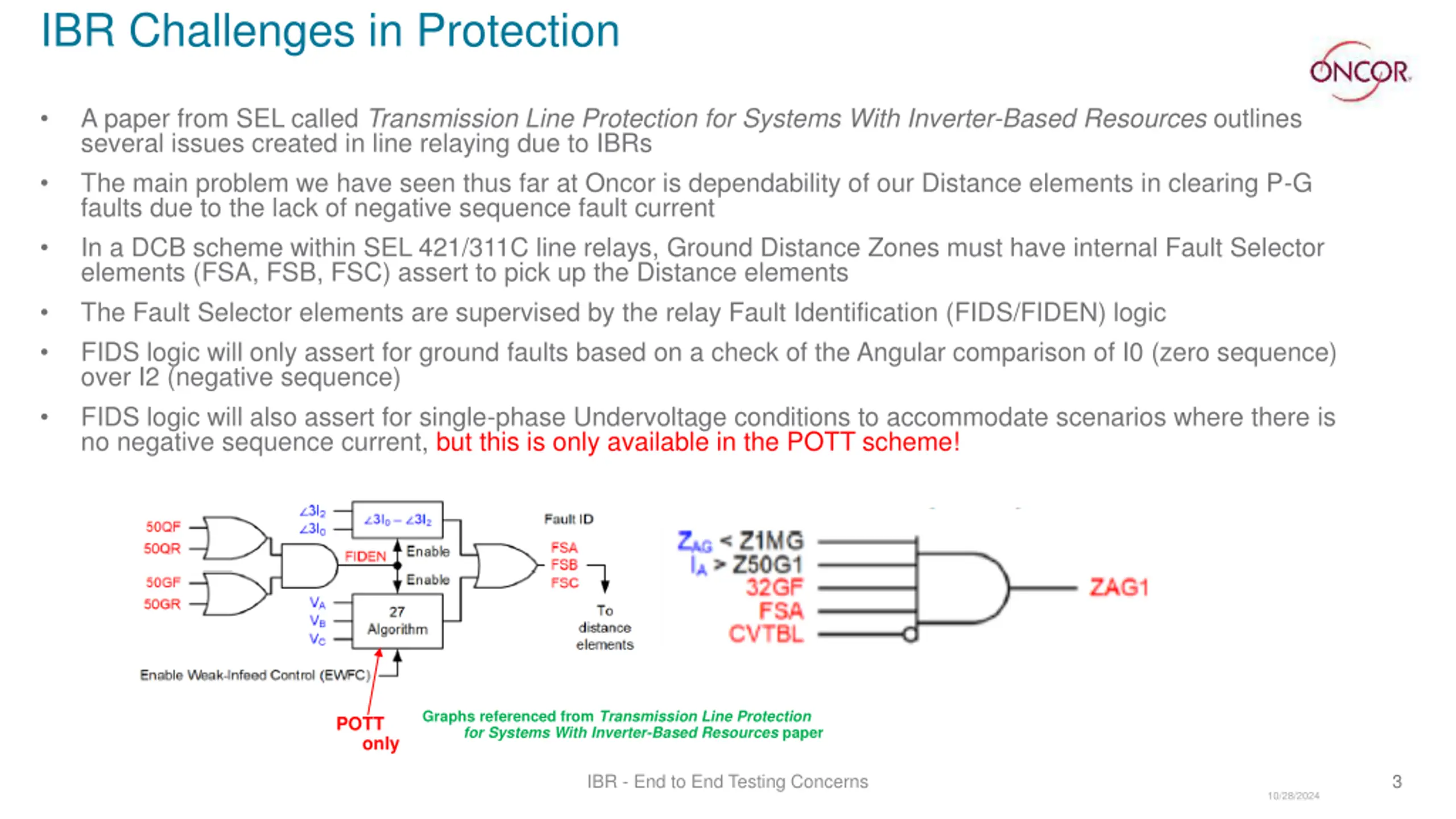 IBR Challenges in Protection A paper from SEL called Transmission Line Protection for Systems With Inverter-Based Resources outlines several issues created in line relaying due to IBRs The main problem we have seen thus far at Oncor is dependability of our Distance elements in clearing P-G faults due to the lack of negative sequence fault current In a DCB scheme within SEL 421/311C line relays, Ground Distance Zones must have internal Fault Selector elements (FSA, FSB, FSC) assert to pick up the Distance elements The Fault Selector elements are supervised by the relay Fault Identification (FIDS/FIDEN) logic FIDS logic will only assert for ground faults based on a check of the Angular comparison of I0 (zero sequence) over I2 (negative sequence) FIDS logic will also assert for single-phase Undervoltage conditions to accommodate scenarios where there is no negative sequence current, but this is only available in the POTT scheme! Graphs referenced from Transmission Line Protection for Systems With Inverter-Based Resources paper POTT only IBR - End to End Testing Concerns 3 10/28/2024