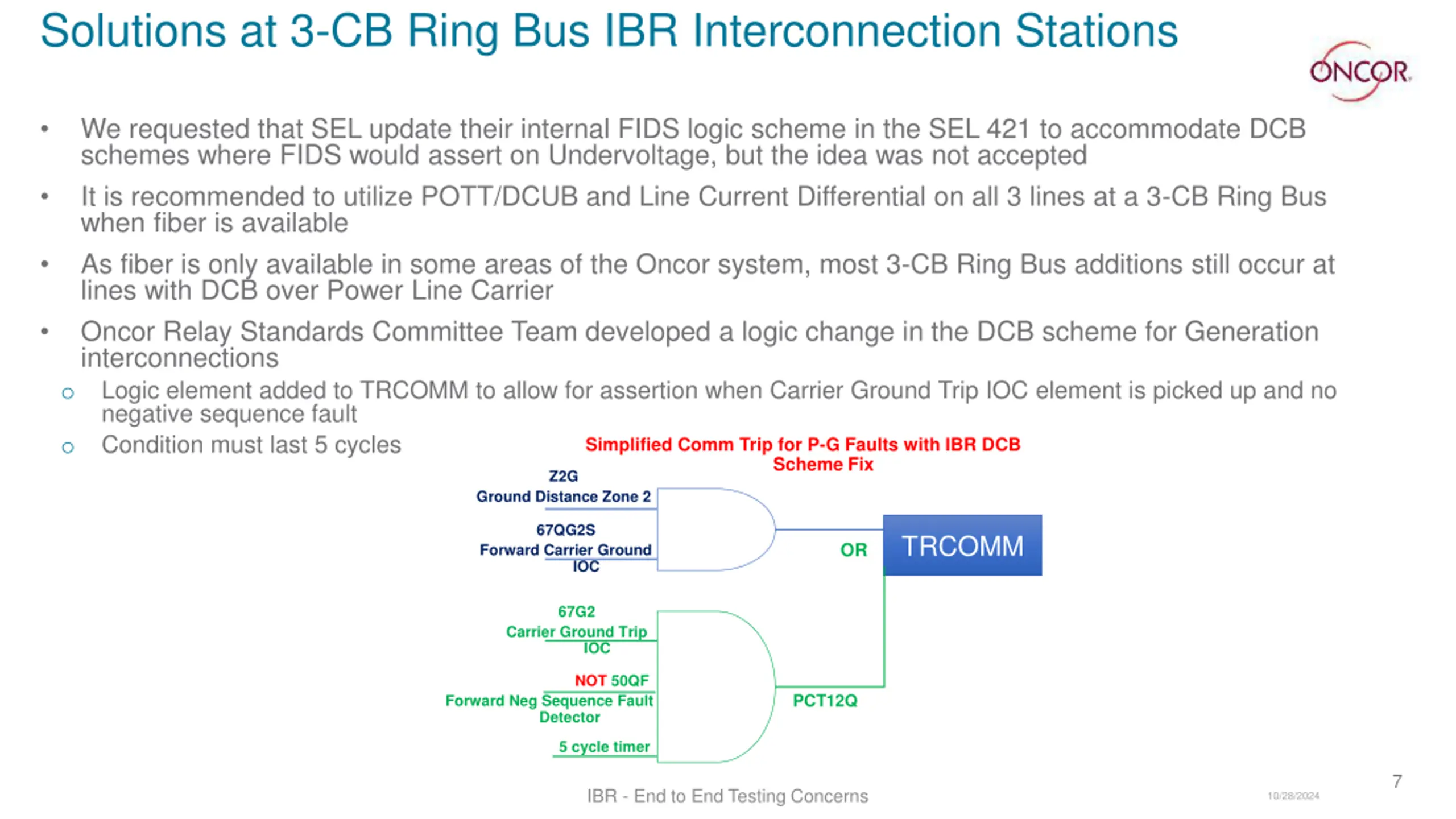 Solutions at 3-CB Ring Bus IBR Interconnection Stations TRCOMM logic change in DCB schemes at 3-CB Ring Bus Generator interconnections was successfully tested in the Lab by Relay Support Logic has been added to the DCB standard setting sheet templates for use 8 10/28/2024 IBR - End to End Testing Concerns