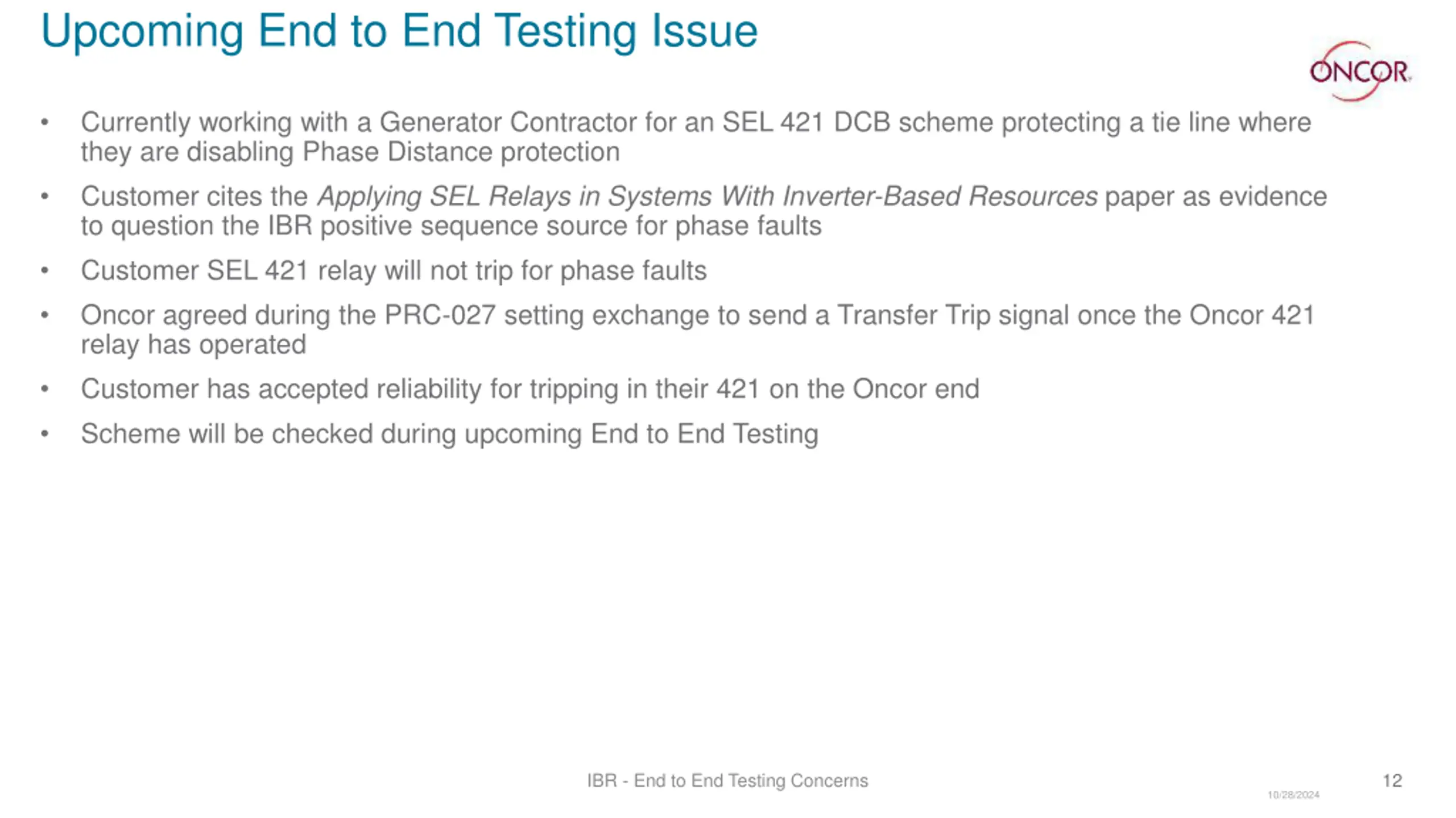 Upcoming End to End Testing Issue Currently working with a Generator Contractor for an SEL 421 DCB scheme protecting a tie line where they are disabling Phase Distance protection Customer cites the Applying SEL Relays in Systems With Inverter-Based Resources paper as evidence to question the IBR positive sequence source for phase faults Customer SEL 421 relay will not trip for phase faults Oncor agreed during the PRC-027 setting exchange to send a Transfer Trip signal once the Oncor 421 relay has operated Customer has accepted reliability for tripping in their 421 on the Oncor end Scheme will be checked during upcoming End to End Testing IBR - End to End Testing Concerns 12 10/28/2024