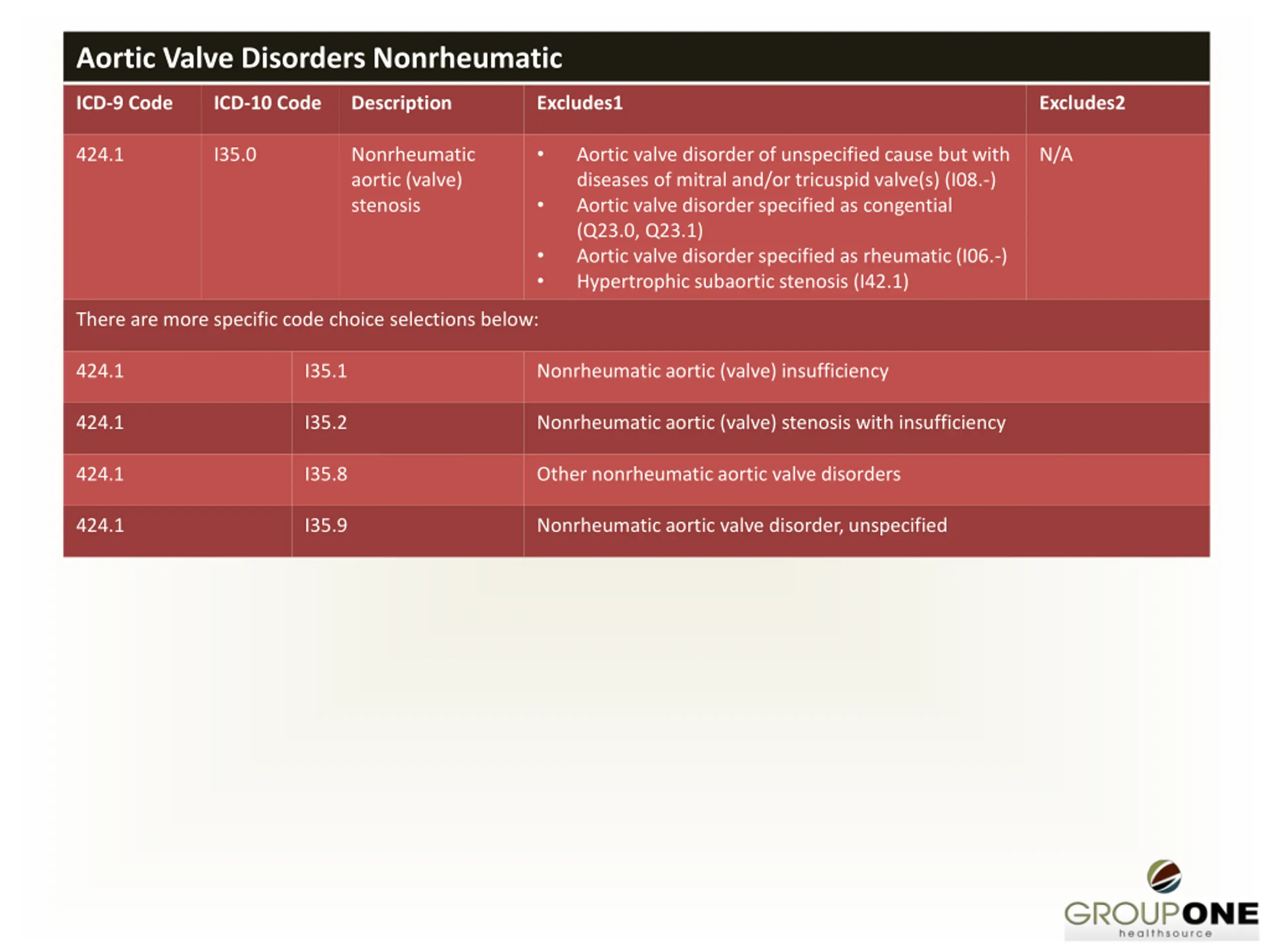 Aortic Valve Disorders Nonrheumatic ICD-9 Code ICD-10 Code Description Excludes1 Excludes2 424.1 I35.0 Nonrheumatic aortic (valve) stenosis Aortic valve disorder of unspecified cause but with diseases of mitral and/or tricuspid valve(s) (I08.-) Aortic valve disorder specified as congential (Q23.0, Q23.1) Aortic valve disorder specified as rheumatic (I06.-) Hypertrophic subaortic stenosis (I42.1) N/A There are more specific code choice selections below: 424.1 I35.1 Nonrheumatic aortic (valve) insufficiency 424.1 I35.2 Nonrheumatic aortic (valve) stenosis with insufficiency 424.1 I35.8 Other nonrheumatic aortic valve disorders 424.1 I35.9 Nonrheumatic aortic valve disorder, unspecified