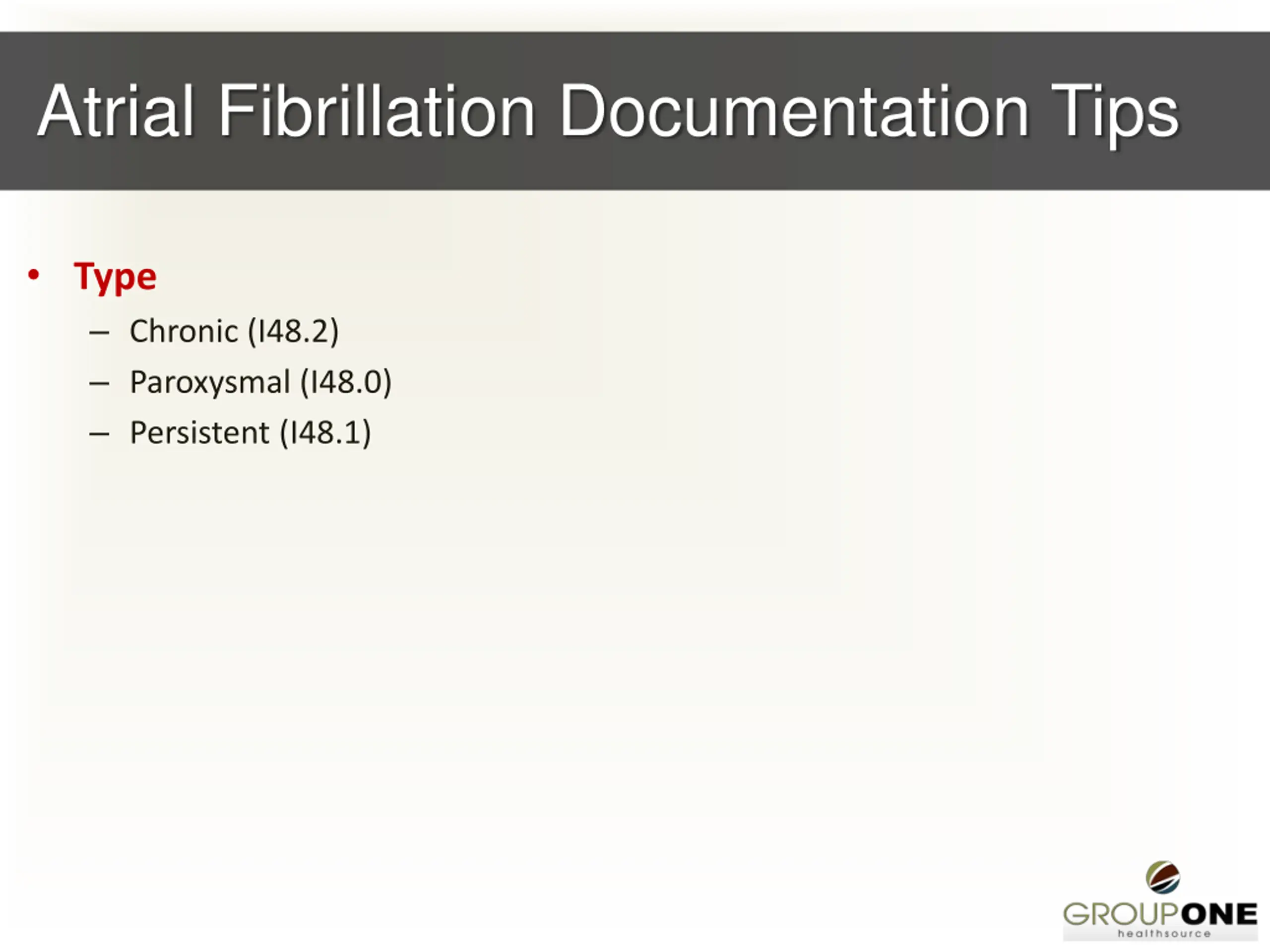 Atrial Fibrillation Documentation Tips Type Chronic (I48.2) Paroxysmal (I48.0) Persistent (I48.1)
