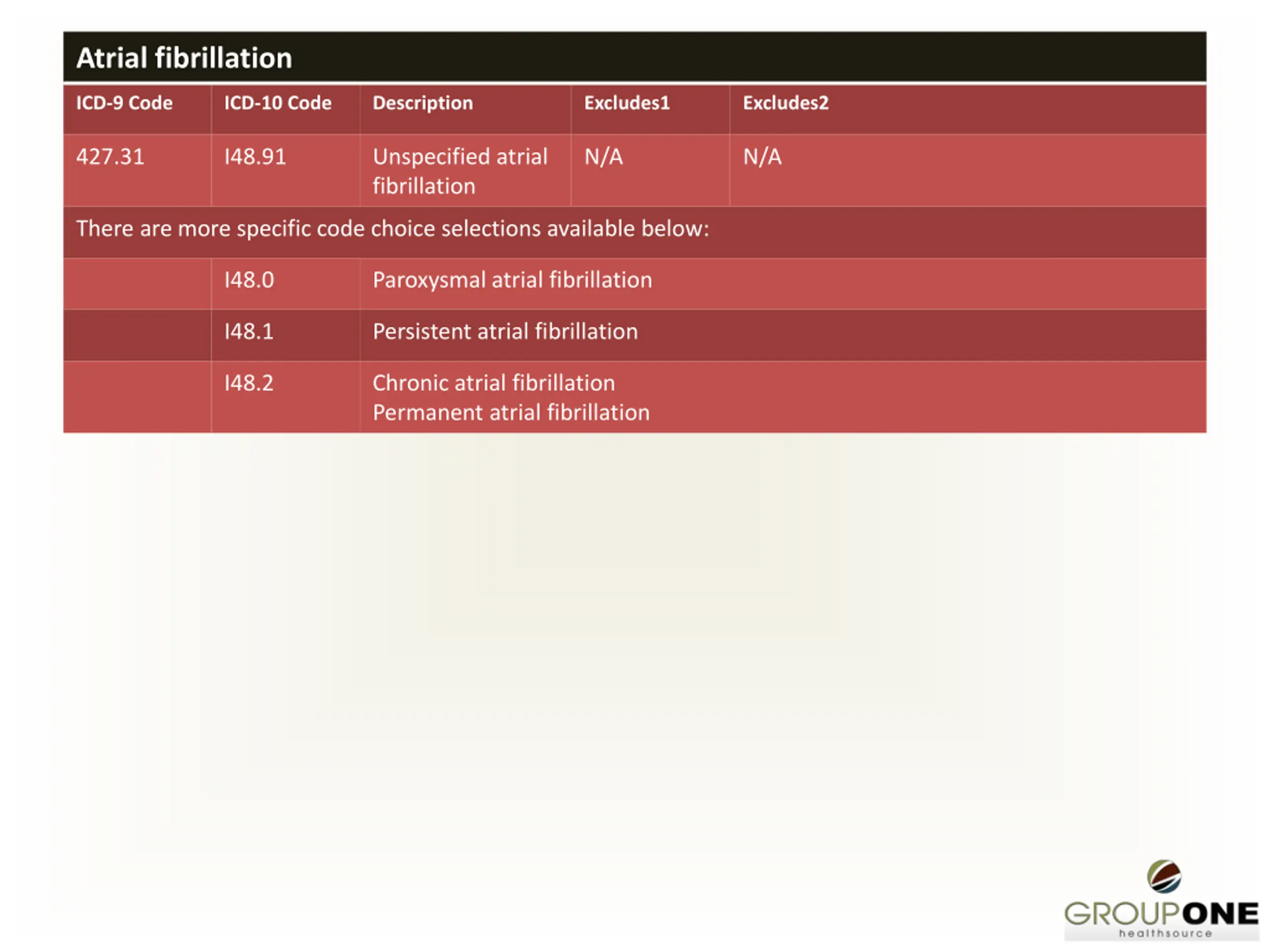 Atrial fibrillation ICD-9 Code ICD-10 Code Description Excludes1 Excludes2 427.31 I48.91 Unspecified atrial fibrillation N/A N/A There are more specific code choice selections available below: I48.0 Paroxysmal atrial fibrillation I48.1 Persistent atrial fibrillation I48.2 Chronic atrial fibrillation Permanent atrial fibrillation