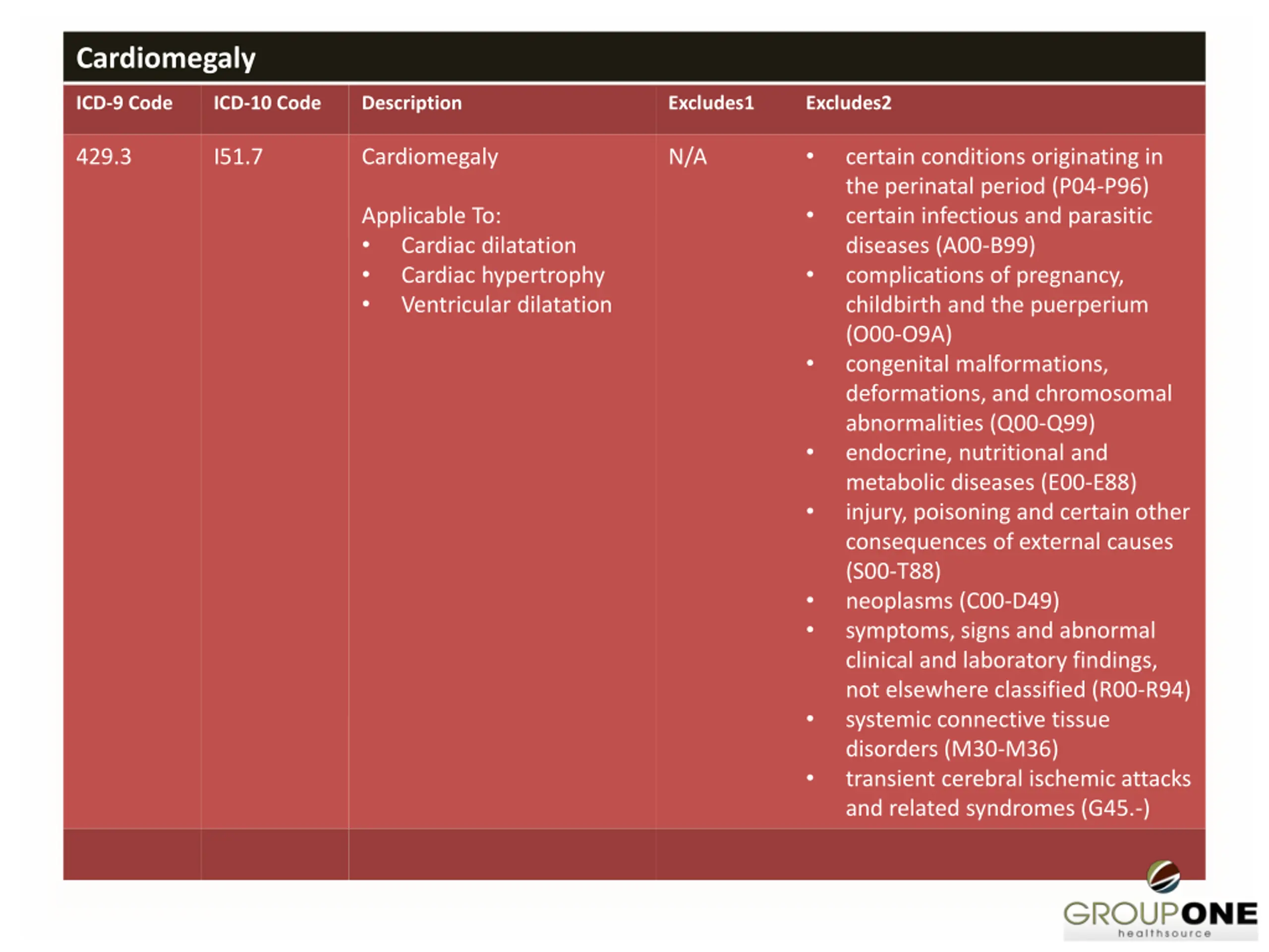 Cardiomegaly ICD-9 Code ICD-10 Code Description Excludes1 Excludes2 429.3 I51.7 Cardiomegaly N/A certain conditions originating in the perinatal period (P04-P96) certain infectious and parasitic diseases (A00-B99) complications of pregnancy, childbirth and the puerperium (O00-O9A) congenital malformations, deformations, and chromosomal abnormalities (Q00-Q99) endocrine, nutritional and metabolic diseases (E00-E88) injury, poisoning and certain other consequences of external causes (S00-T88) neoplasms (C00-D49) symptoms, signs and abnormal clinical and laboratory findings, not elsewhere classified (R00-R94) systemic connective tissue disorders (M30-M36) transient cerebral ischemic attacks and related syndromes (G45.-) Applicable To: Cardiac dilatation Cardiac hypertrophy Ventricular dilatation