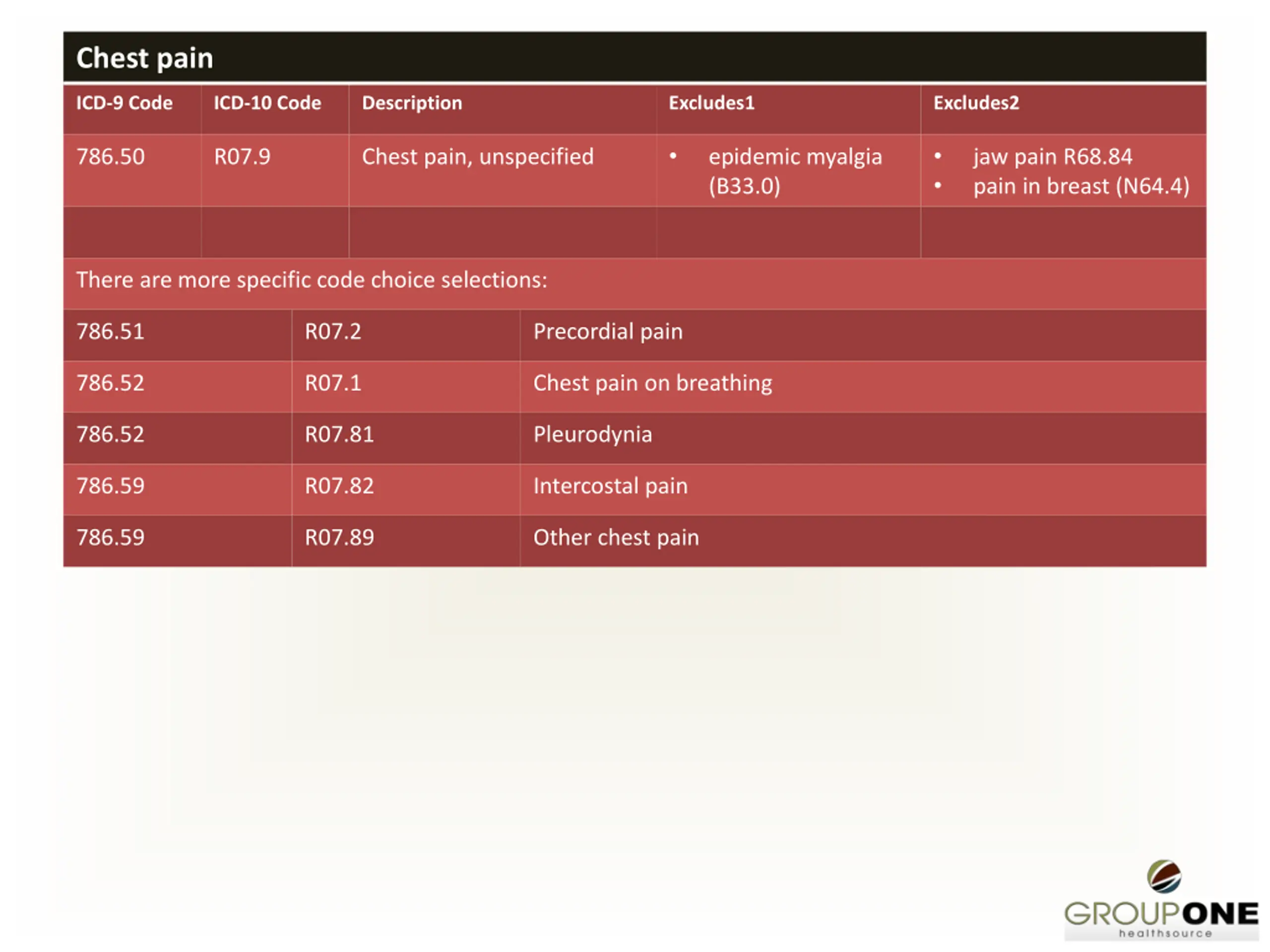 Chest pain ICD-9 Code ICD-10 Code Description Excludes1 Excludes2 786.50 R07.9 Chest pain, unspecified epidemic myalgia (B33.0) jaw pain R68.84 pain in breast (N64.4) There are more specific code choice selections: 786.51 R07.2 Precordial pain 786.52 R07.1 Chest pain on breathing 786.52 R07.81 Pleurodynia 786.59 R07.82 Intercostal pain 786.59 R07.89 Other chest pain