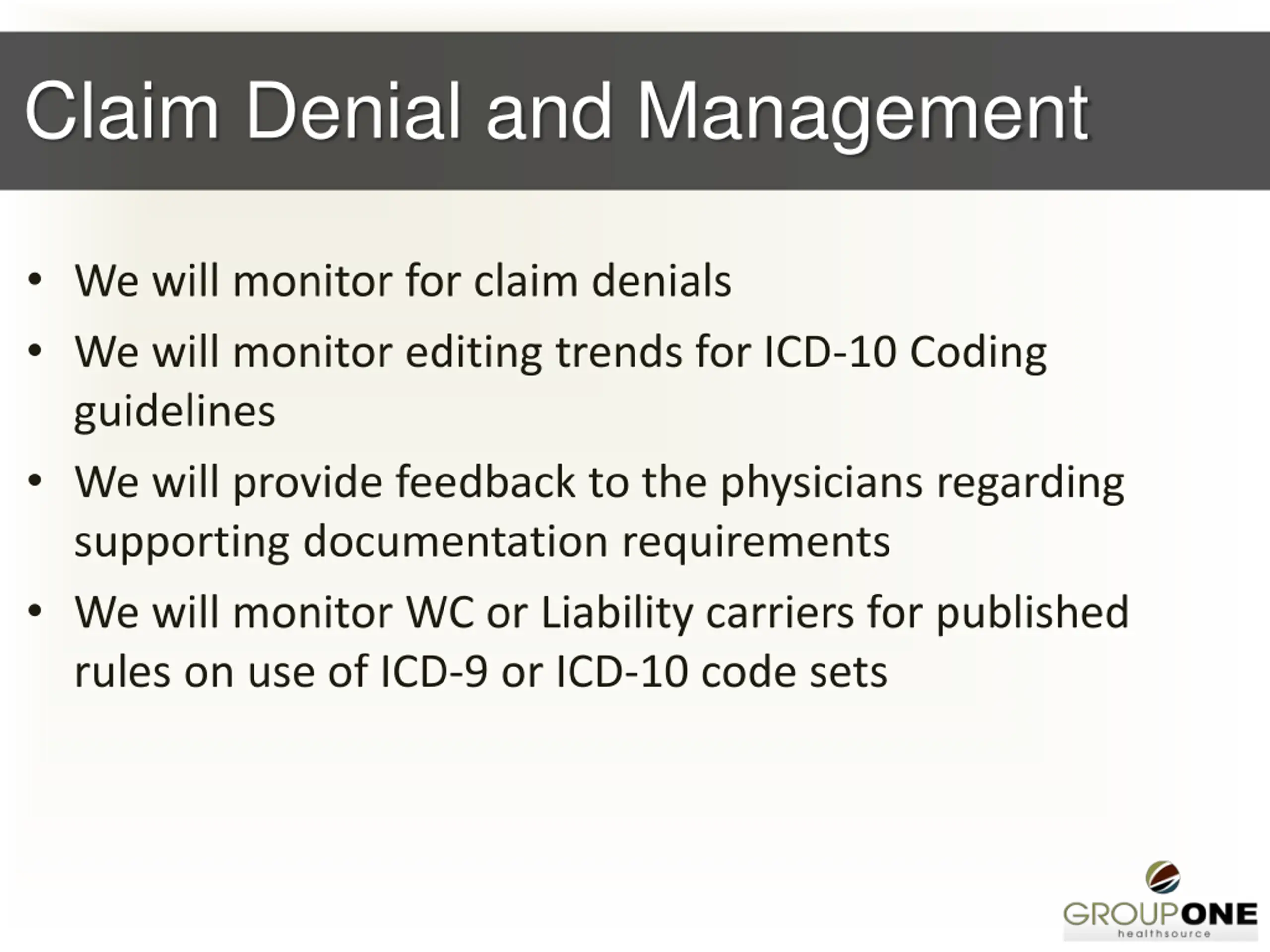 Claim Denial and Management We will monitor for claim denials We will monitor editing trends for ICD-10 Coding guidelines We will provide feedback to the physicians regarding supporting documentation requirements We will monitor WC or Liability carriers for published rules on use of ICD-9 or ICD-10 code sets