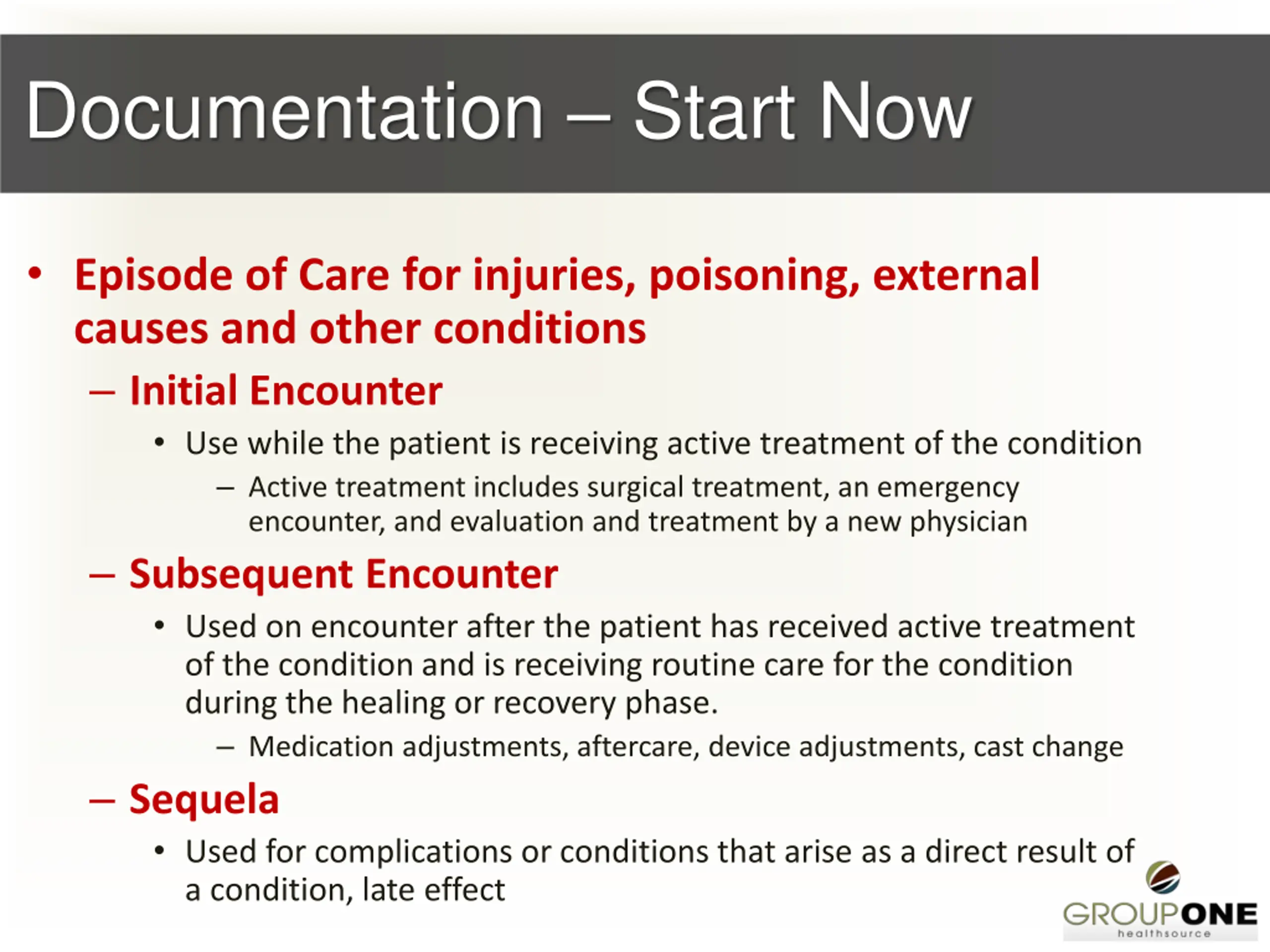 Documentation Start Now Episode of Care for injuries, poisoning, external causes and other conditions Initial Encounter Use while the patient is receiving active treatment of the condition Active treatment includes surgical treatment, an emergency encounter, and evaluation and treatment by a new physician Subsequent Encounter Used on encounter after the patient has received active treatment of the condition and is receiving routine care for the condition during the healing or recovery phase. Medication adjustments, aftercare, device adjustments, cast change Sequela Used for complications or conditions that arise as a direct result of a condition, late effect