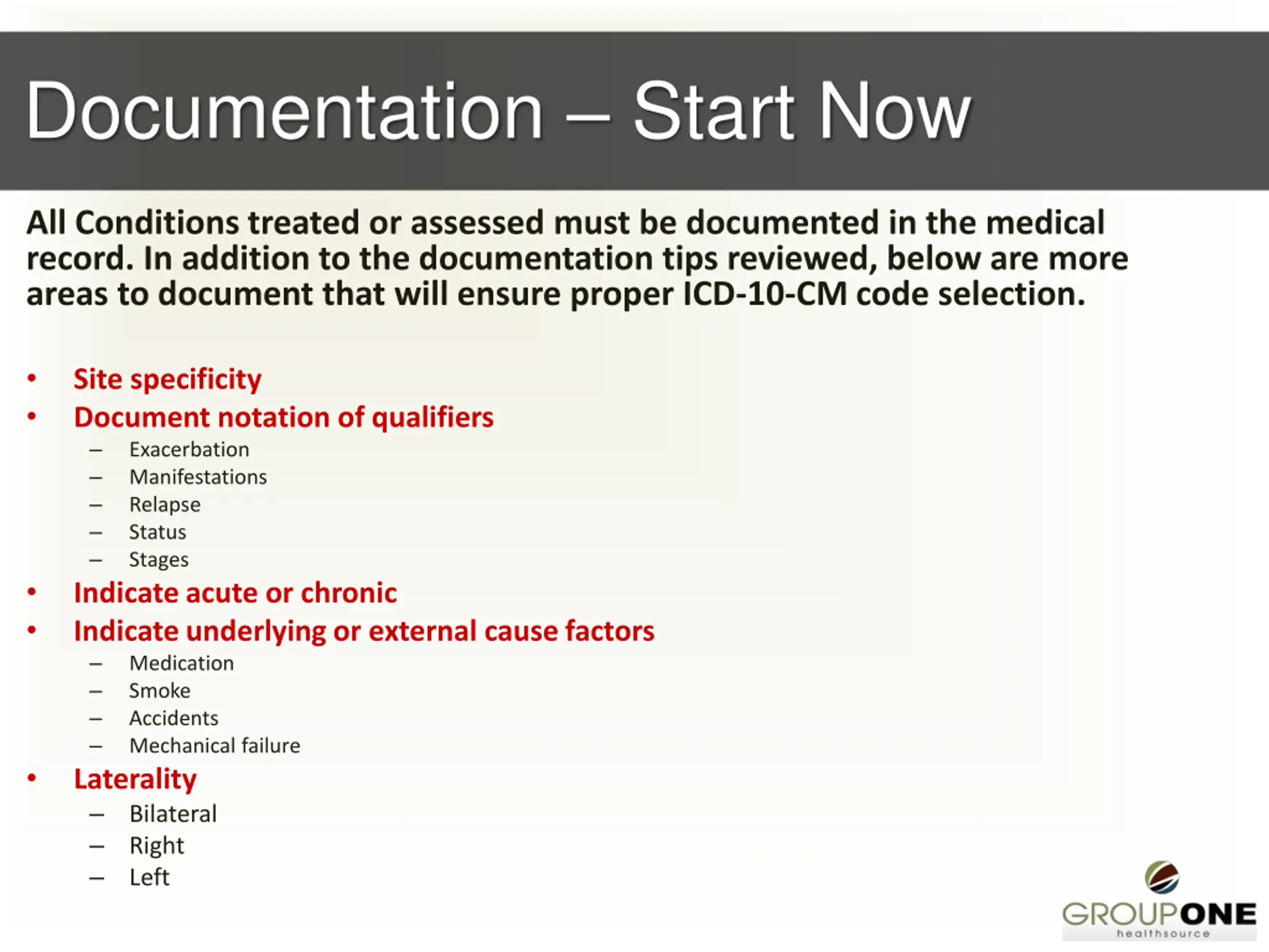 Documentation Start Now All Conditions treated or assessed must be documented in the medical record. In addition to the documentation tips reviewed, below are more areas to document that will ensure proper ICD-10-CM code selection. Site specificity Document notation of qualifiers Exacerbation Manifestations Relapse Status Stages Indicate acute or chronic Indicate underlying or external cause factors Medication Smoke Accidents Mechanical failure Laterality Bilateral Right Left