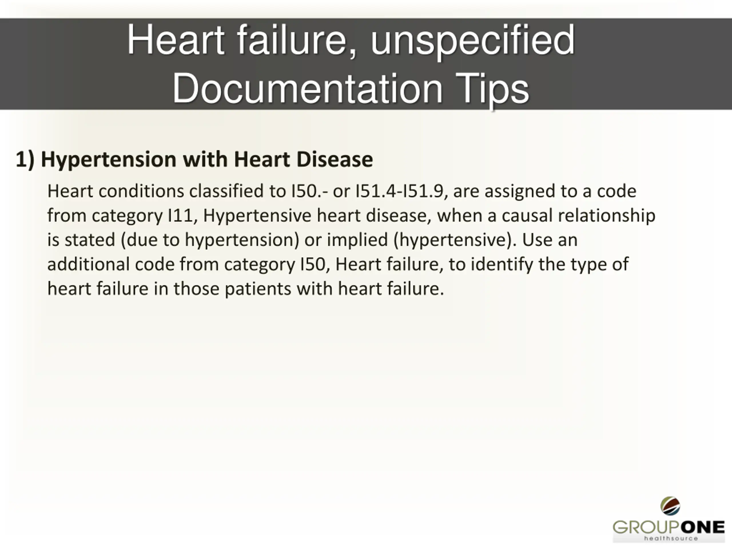Heart failure, unspecified Documentation Tips 1) Hypertension with Heart Disease Heart conditions classified to I50.- or I51.4-I51.9, are assigned to a code from category I11, Hypertensive heart disease, when a causal relationship is stated (due to hypertension) or implied (hypertensive). Use an additional code from category I50, Heart failure, to identify the type of heart failure in those patients with heart failure.