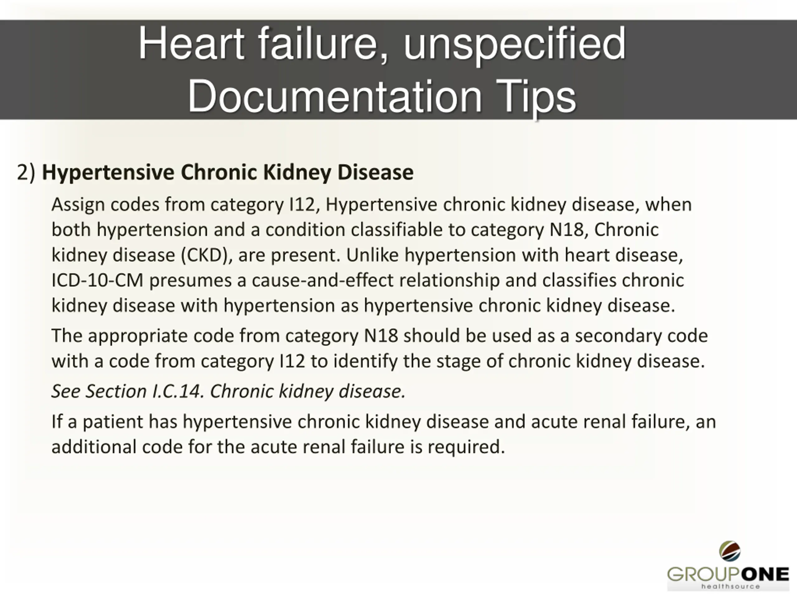 Heart failure, unspecified Documentation Tips 2) Hypertensive Chronic Kidney Disease Assign codes from category I12, Hypertensive chronic kidney disease, when both hypertension and a condition classifiable to category N18, Chronic kidney disease (CKD), are present. Unlike hypertension with heart disease, ICD-10-CM presumes a cause-and-effect relationship and classifies chronic kidney disease with hypertension as hypertensive chronic kidney disease. The appropriate code from category N18 should be used as a secondary code with a code from category I12 to identify the stage of chronic kidney disease. See Section I.C.14. Chronic kidney disease. If a patient has hypertensive chronic kidney disease and acute renal failure, an additional code for the acute renal failure is required.