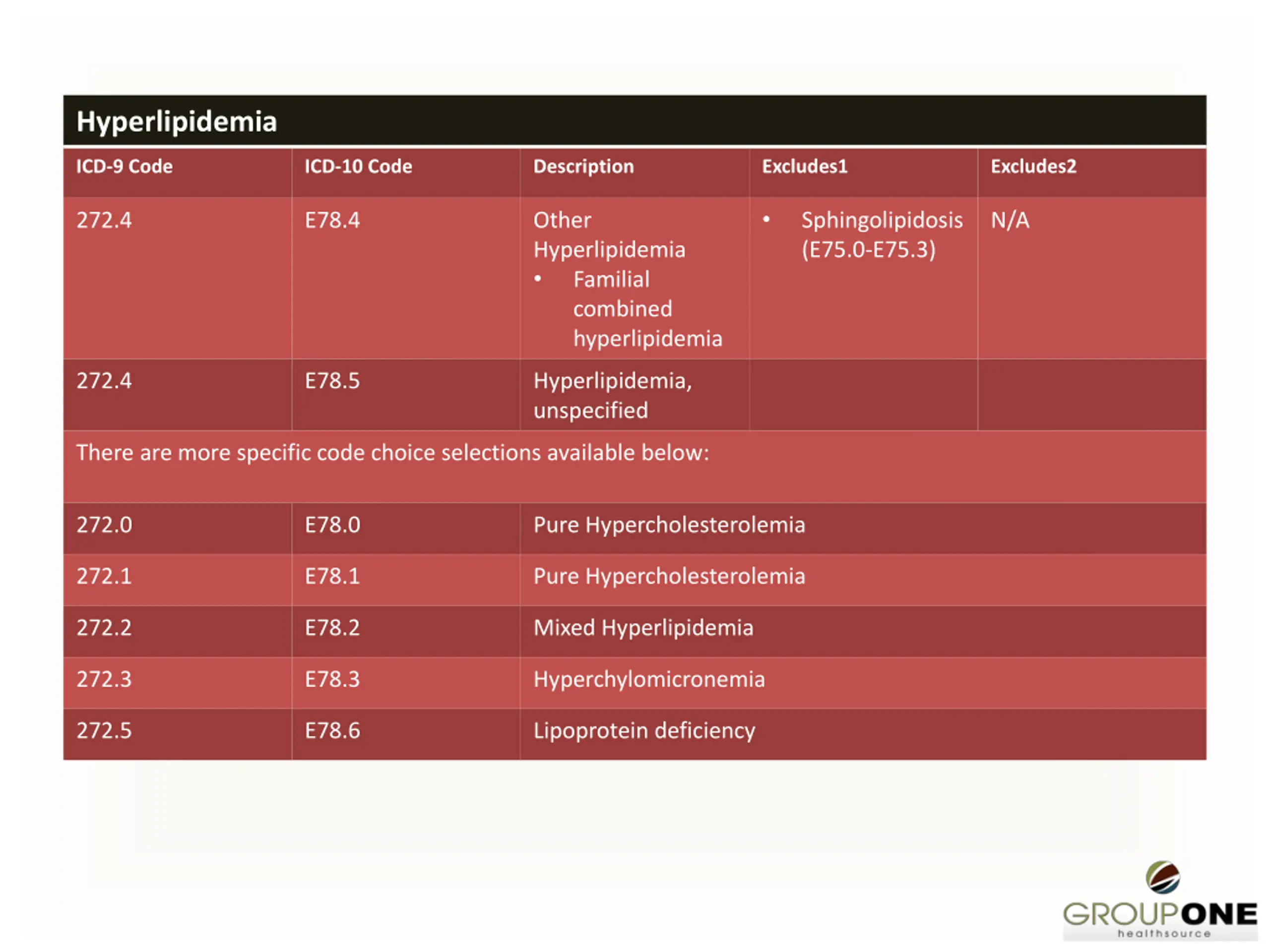 Hyperlipidemia ICD-9 Code ICD-10 Code Description Excludes1 Excludes2 272.4 E78.4 Other Hyperlipidemia Familial combined hyperlipidemia Sphingolipidosis (E75.0-E75.3) N/A 272.4 E78.5 Hyperlipidemia, unspecified There are more specific code choice selections available below: 272.0 E78.0 Pure Hypercholesterolemia 272.1 E78.1 Pure Hypercholesterolemia 272.2 E78.2 Mixed Hyperlipidemia 272.3 E78.3 Hyperchylomicronemia 272.5 E78.6 Lipoprotein deficiency