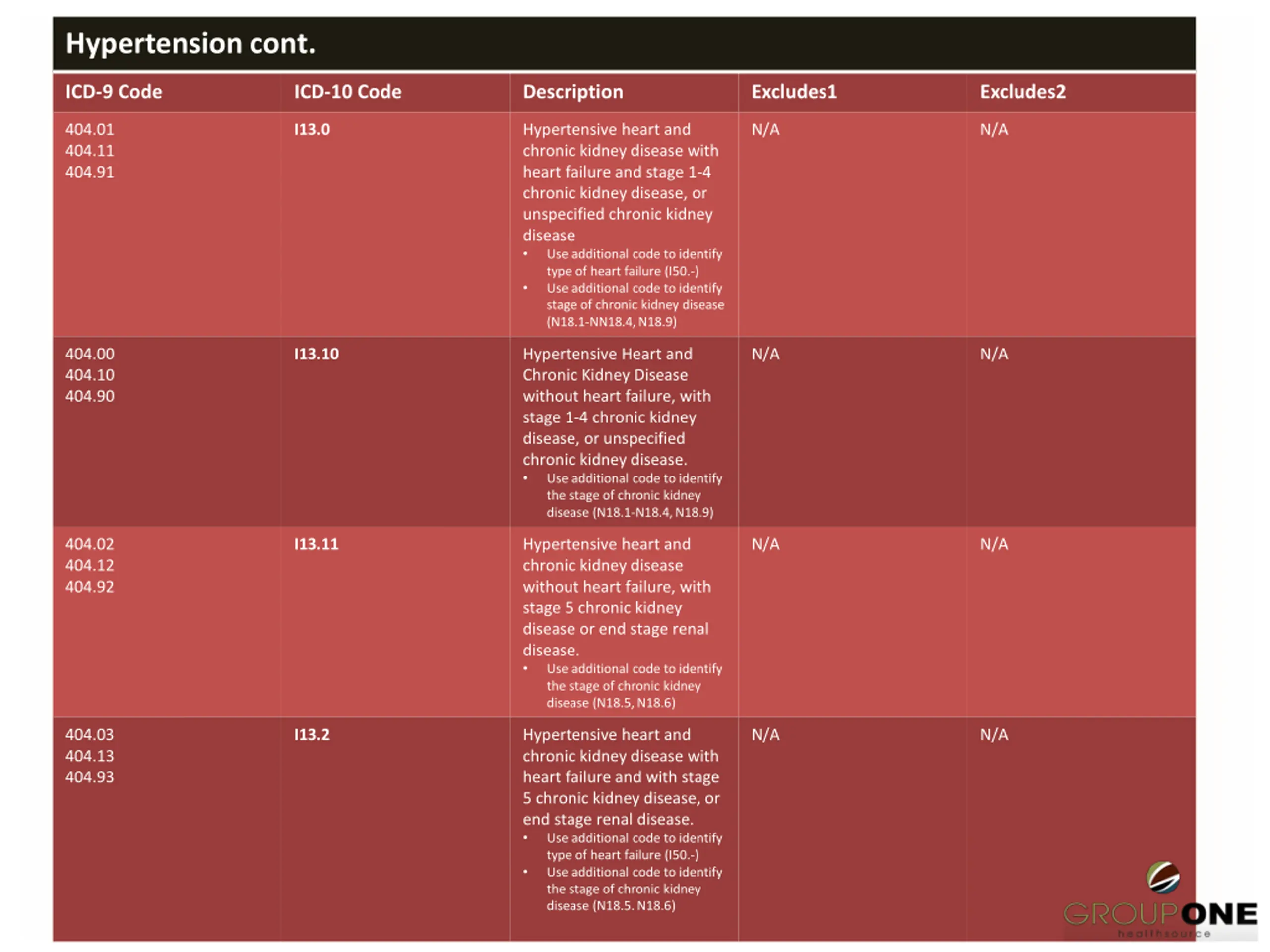 Hypertension cont. ICD-9 Code ICD-10 Code Description Excludes1 Excludes2 404.01 404.11 404.91 I13.0 Hypertensive heart and chronic kidney disease with heart failure and stage 1-4 chronic kidney disease, or unspecified chronic kidney disease Use additional code to identify type of heart failure (I50.-) Use additional code to identify stage of chronic kidney disease (N18.1-NN18.4, N18.9) N/A N/A 404.00 404.10 404.90 I13.10 Hypertensive Heart and Chronic Kidney Disease without heart failure, with stage 1-4 chronic kidney disease, or unspecified chronic kidney disease. Use additional code to identify the stage of chronic kidney disease (N18.1-N18.4, N18.9) N/A N/A 404.02 404.12 404.92 I13.11 Hypertensive heart and chronic kidney disease without heart failure, with stage 5 chronic kidney disease or end stage renal disease. Use additional code to identify the stage of chronic kidney disease (N18.5, N18.6) N/A N/A 404.03 404.13 404.93 I13.2 Hypertensive heart and chronic kidney disease with heart failure and with stage 5 chronic kidney disease, or end stage renal disease. Use additional code to identify type of heart failure (I50.-) Use additional code to identify the stage of chronic kidney disease (N18.5. N18.6) N/A N/A