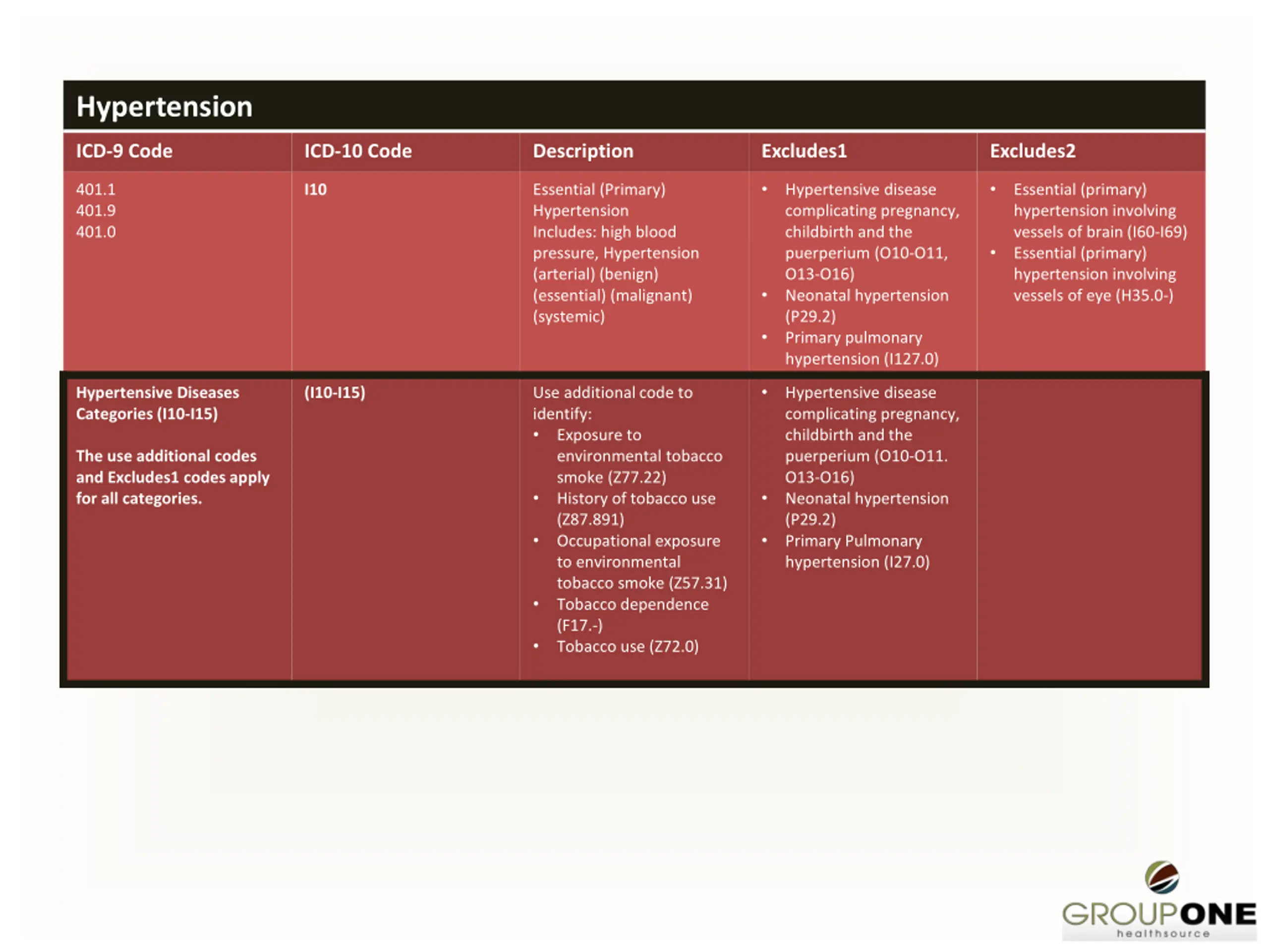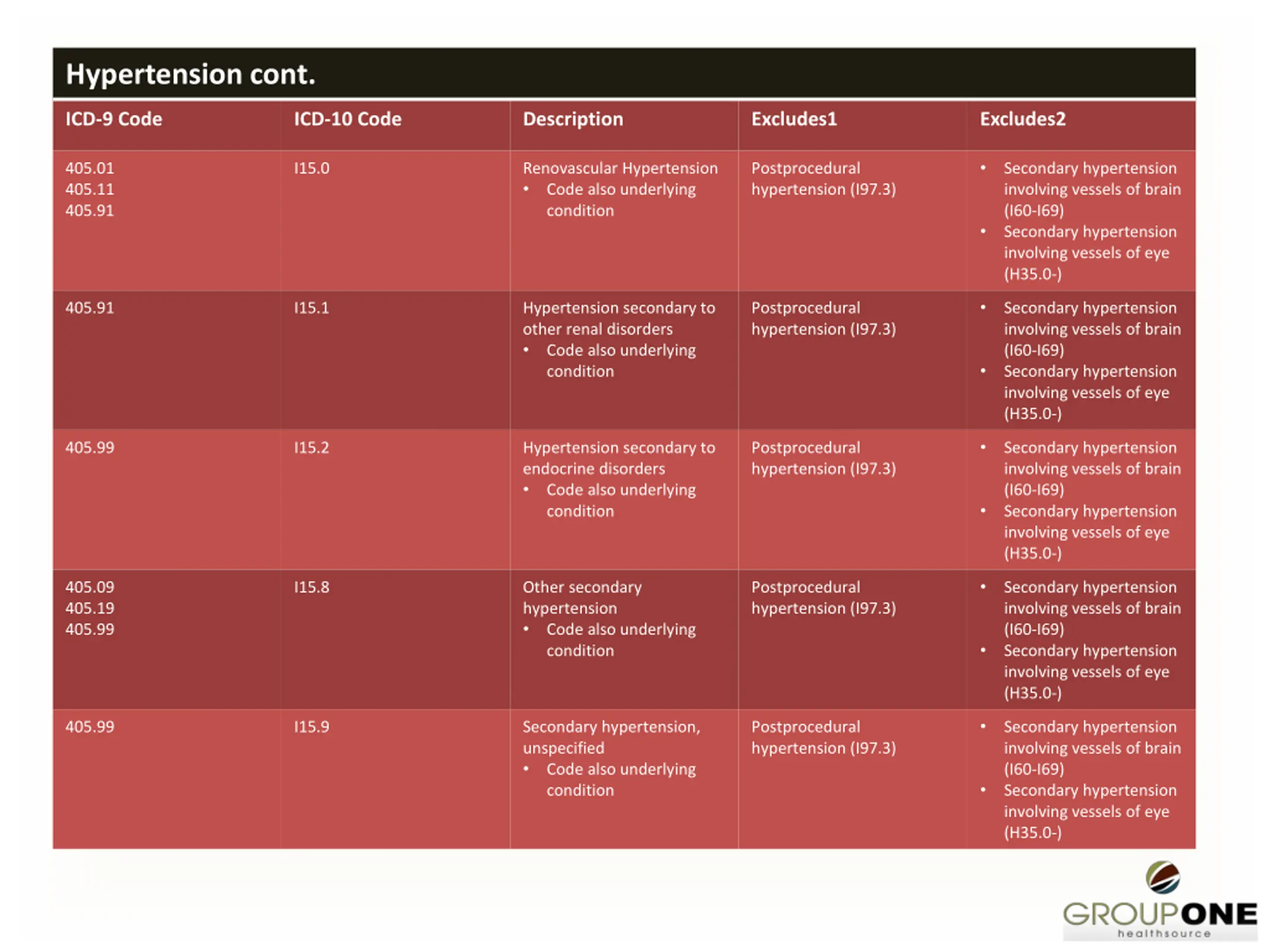Hypertension cont. ICD-9 Code ICD-10 Code Description Excludes1 Excludes2 405.01 405.11 405.91 I15.0 Renovascular Hypertension Code also underlying condition Postprocedural hypertension (I97.3) Secondary hypertension involving vessels of brain (I60-I69) Secondary hypertension involving vessels of eye (H35.0-) 405.91 I15.1 Hypertension secondary to other renal disorders Code also underlying condition Postprocedural hypertension (I97.3) Secondary hypertension involving vessels of brain (I60-I69) Secondary hypertension involving vessels of eye (H35.0-) 405.99 I15.2 Hypertension secondary to endocrine disorders Code also underlying condition Postprocedural hypertension (I97.3) Secondary hypertension involving vessels of brain (I60-I69) Secondary hypertension involving vessels of eye (H35.0-) 405.09 405.19 405.99 I15.8 Other secondary hypertension Code also underlying condition Postprocedural hypertension (I97.3) Secondary hypertension involving vessels of brain (I60-I69) Secondary hypertension involving vessels of eye (H35.0-) 405.99 I15.9 Secondary hypertension, unspecified Code also underlying condition Postprocedural hypertension (I97.3) Secondary hypertension involving vessels of brain (I60-I69) Secondary hypertension involving vessels of eye (H35.0-)