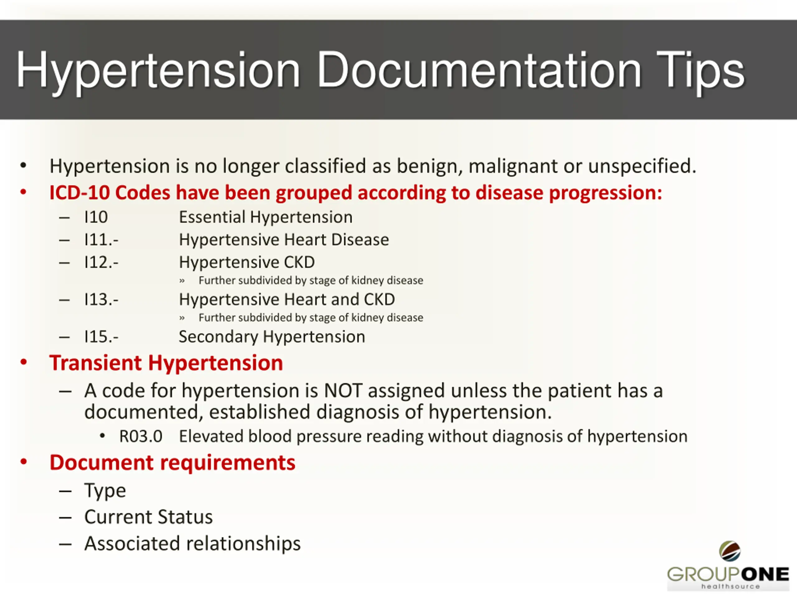 Hypertension Documentation Tips Hypertension is no longer classified as benign, malignant or unspecified. ICD-10 Codes have been grouped according to disease progression: I10 Essential Hypertension I11.- Hypertensive Heart Disease I12.- Hypertensive CKD Further subdivided by stage of kidney disease I13.- Hypertensive Heart and CKD Further subdivided by stage of kidney disease I15.- Secondary Hypertension Transient Hypertension A code for hypertension is NOT assigned unless the patient has a documented, established diagnosis of hypertension. R03.0 Elevated blood pressure reading without diagnosis of hypertension Document requirements Type Current Status Associated relationships