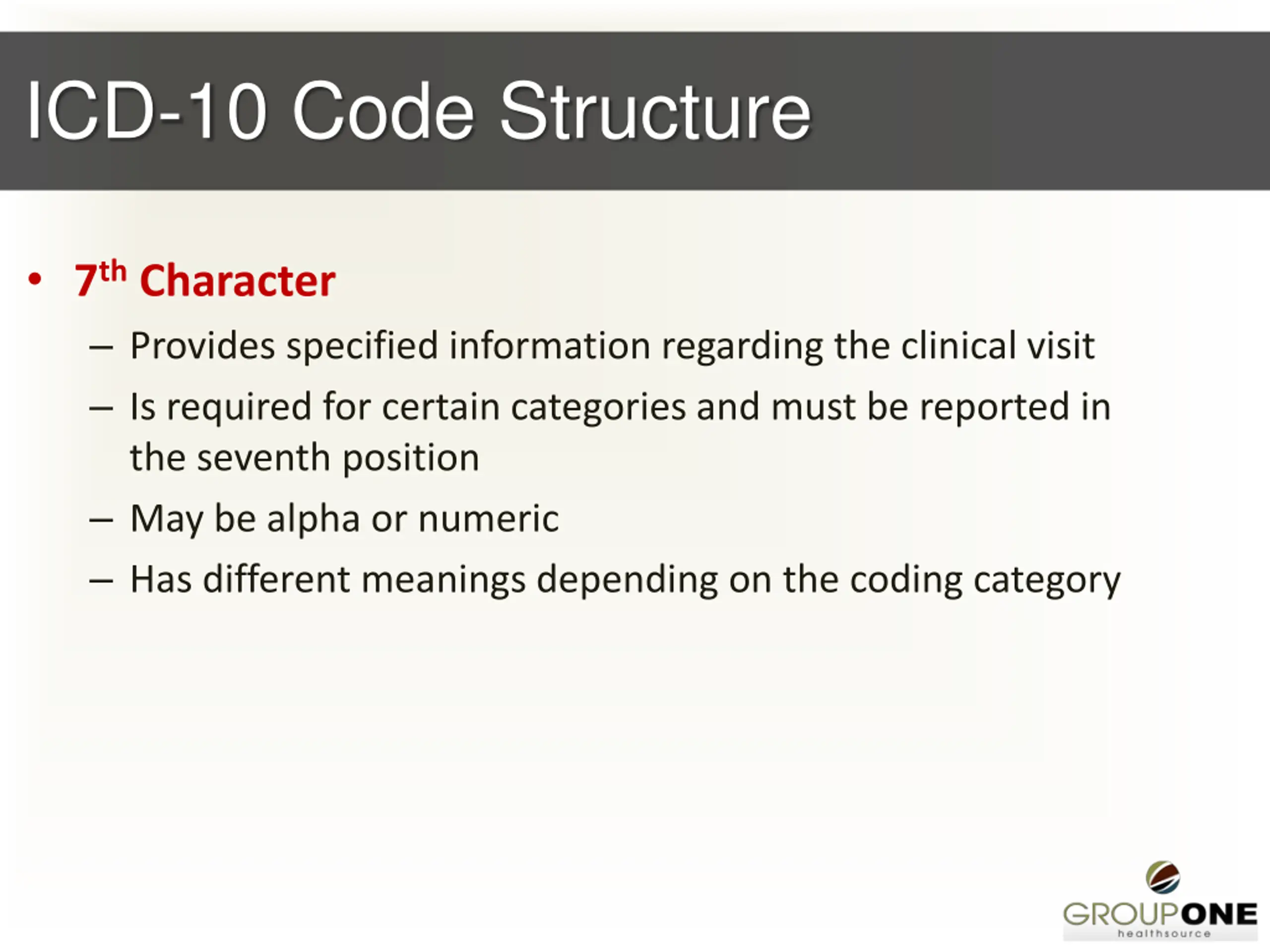ICD-10 Code Structure 7thCharacter Provides specified information regarding the clinical visit Is required for certain categories and must be reported in the seventh position May be alpha or numeric Has different meanings depending on the coding category