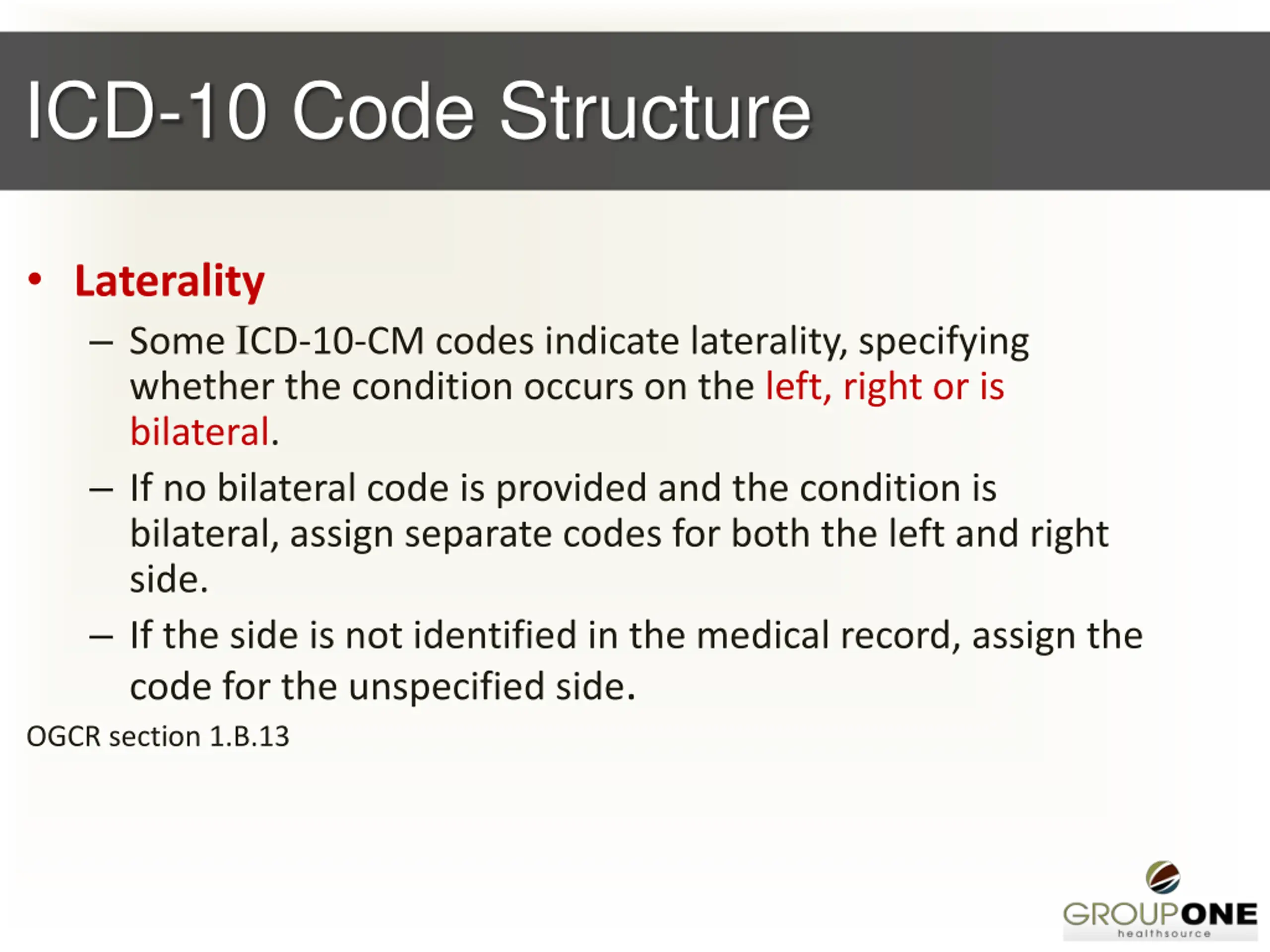 ICD-10 Code Structure Laterality Some ICD-10-CM codes indicate laterality, specifying whether the condition occurs on the left, right or is bilateral. If no bilateral code is provided and the condition is bilateral, assign separate codes for both the left and right side. If the side is not identified in the medical record, assign the code for the unspecified side. OGCR section 1.B.13
