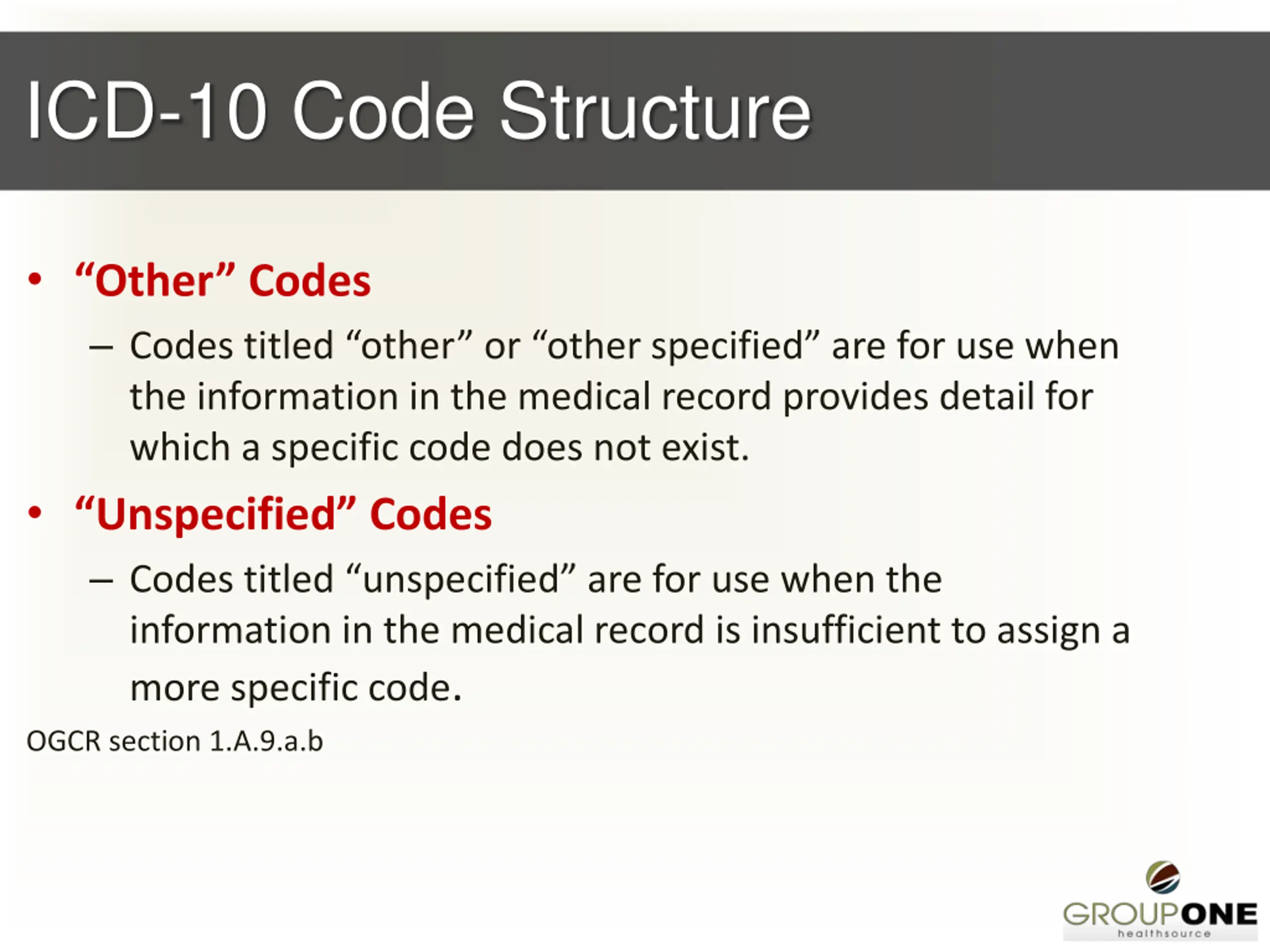ICD-10 Code Structure Other Codes Codes titled other or other specified are for use when the information in the medical record provides detail for which a specific code does not exist. Unspecified Codes Codes titled unspecified are for use when the information in the medical record is insufficient to assign a more specific code. OGCR section 1.A.9.a.b