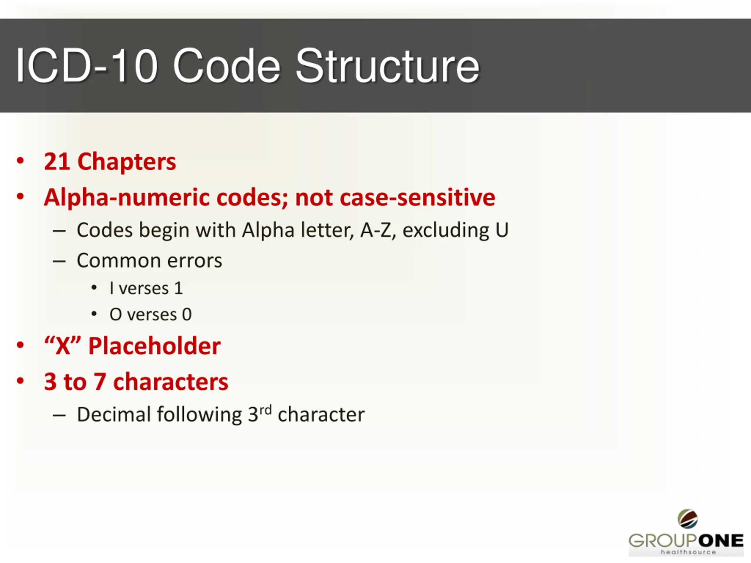 ICD-10 Code Structure 21 Chapters Alpha-numeric codes; not case-sensitive Codes begin with Alpha letter, A-Z, excluding U Common errors I verses 1 O verses 0 X Placeholder 3 to 7 characters Decimal following 3rdcharacter