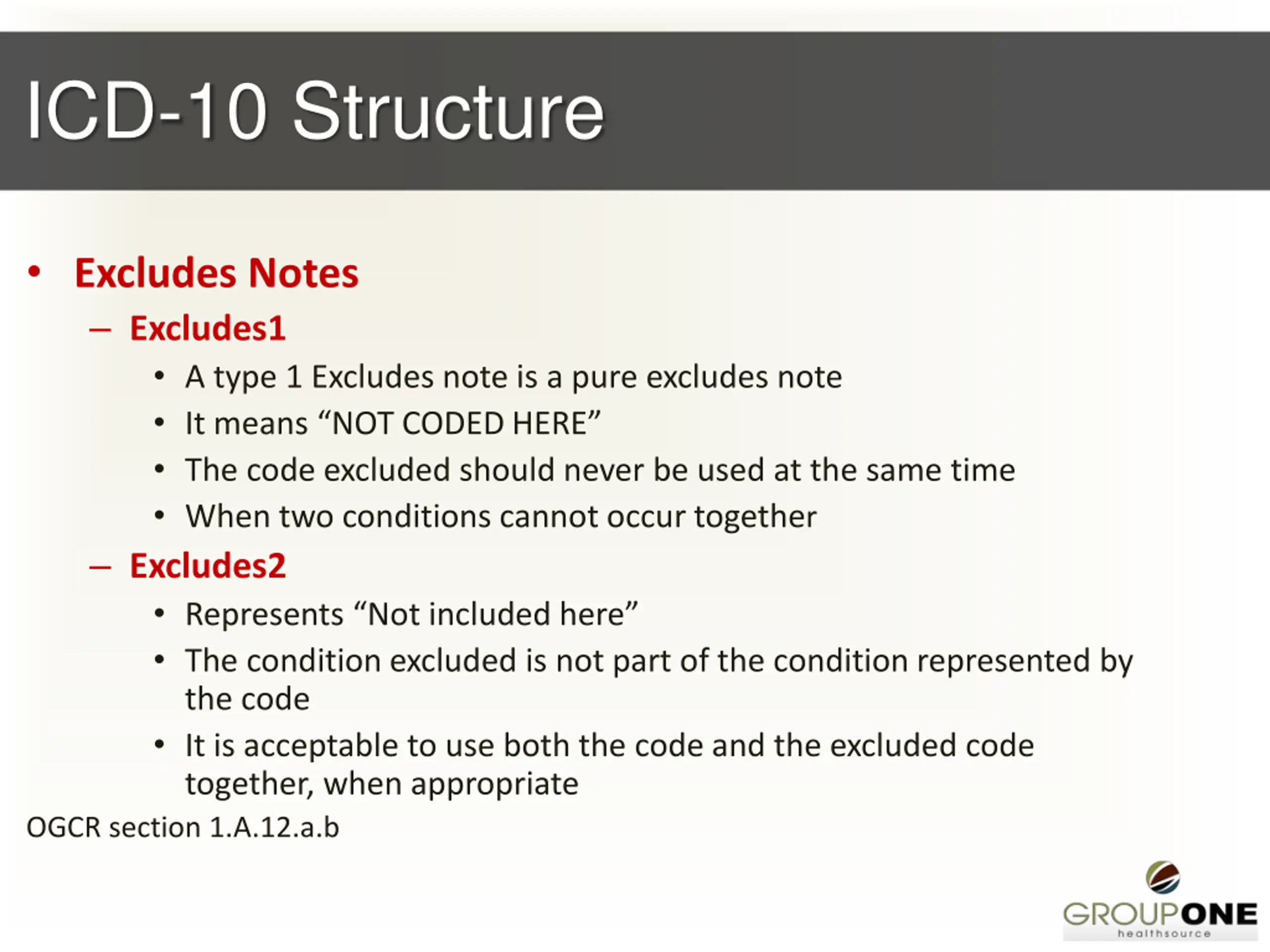ICD-10 Structure Excludes Notes Excludes1 A type 1 Excludes note is a pure excludes note It means NOT CODED HERE The code excluded should never be used at the same time When two conditions cannot occur together Excludes2 Represents Not included here The condition excluded is not part of the condition represented by the code It is acceptable to use both the code and the excluded code together, when appropriate OGCR section 1.A.12.a.b